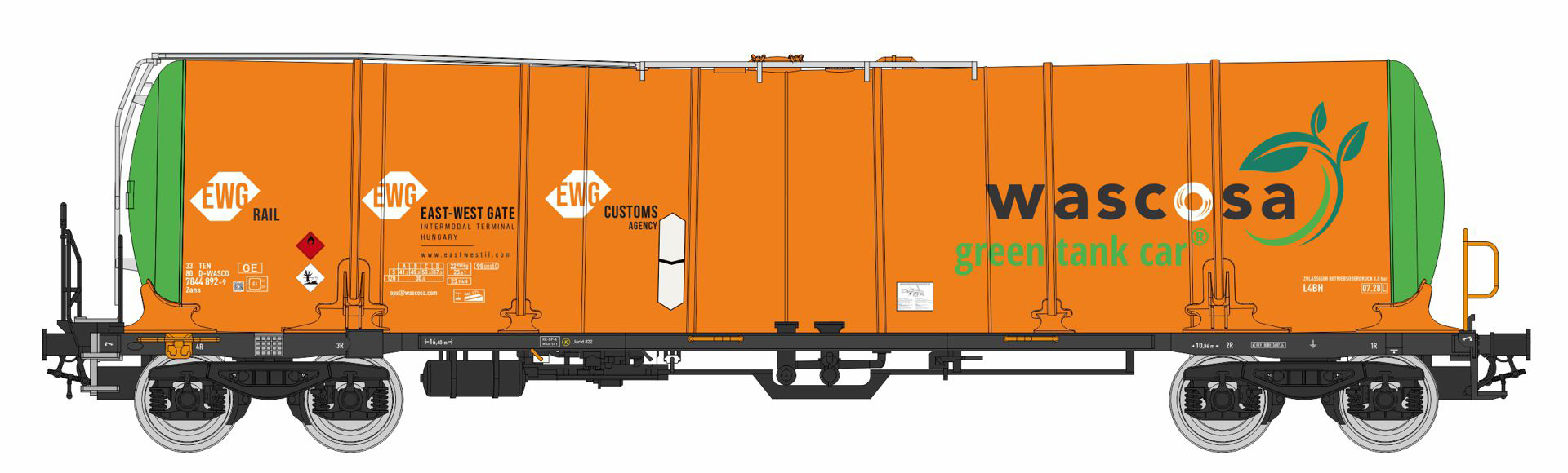 | kotlový vůz oranžový-zelený s logem „wascosa - green tank car“ |