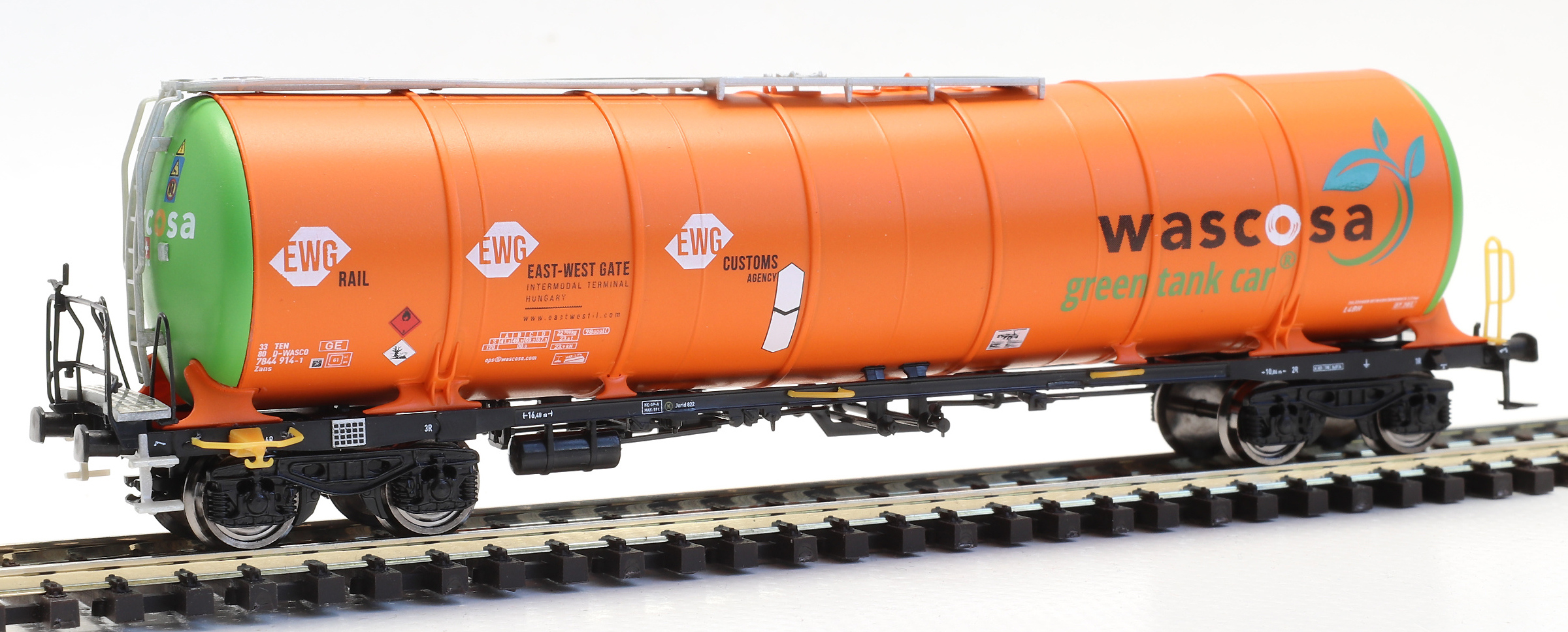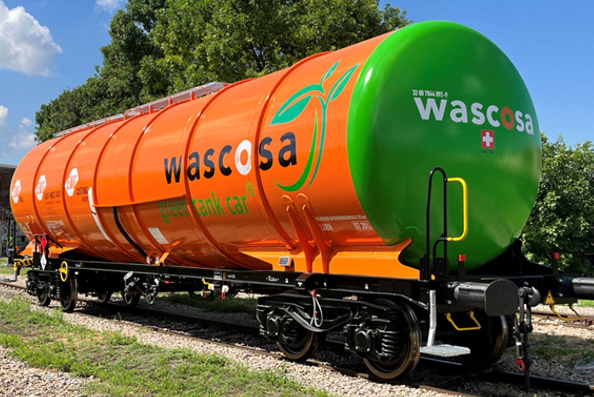 | kotlový vůz oranžový-zelený s logem „wascosa - green tank car“ |