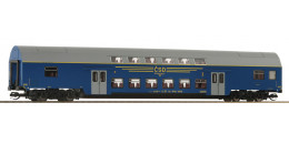 | středový patrový vůz v barvě modré, šedá střecha a dveře |