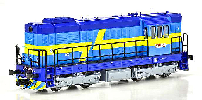 | dieselová lokomotiva světle modrá-tmavě modrá, lomený žlutý výstražný pruh |