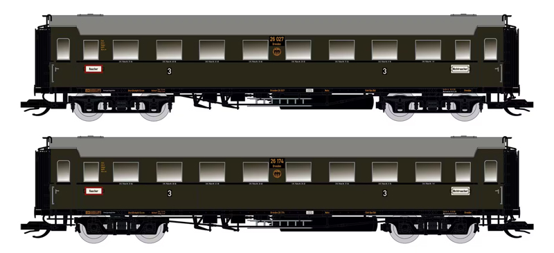 | oddílový osobní vůz tmavě zelený s šedou střechou 3. tř. |