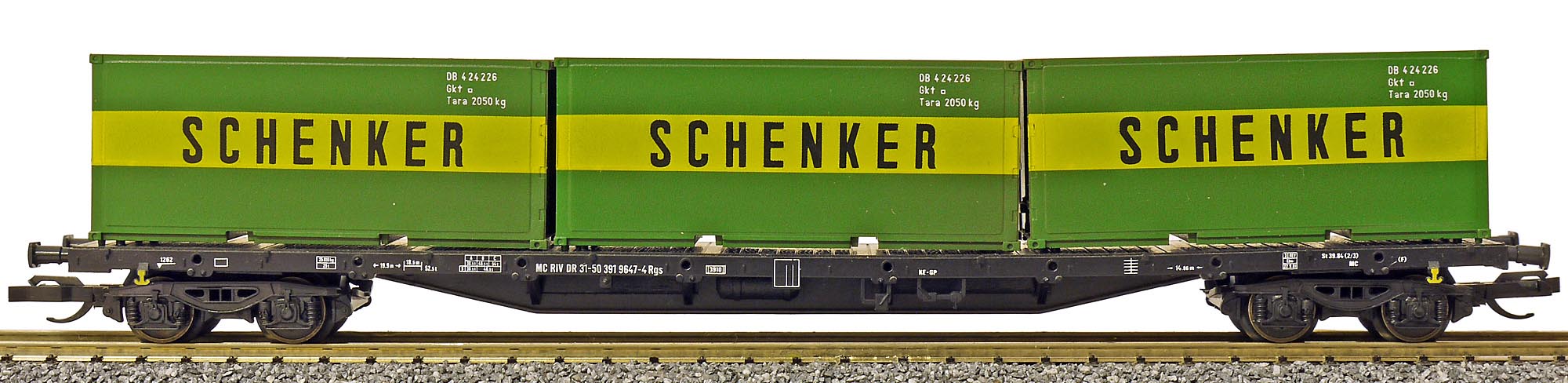 | nákladní plošinový vůz černý se třemi kontejnery 20' „SCHENKER“ |