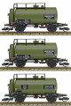 | set tří zelených kotlových vozů s brzdařskými budkami |