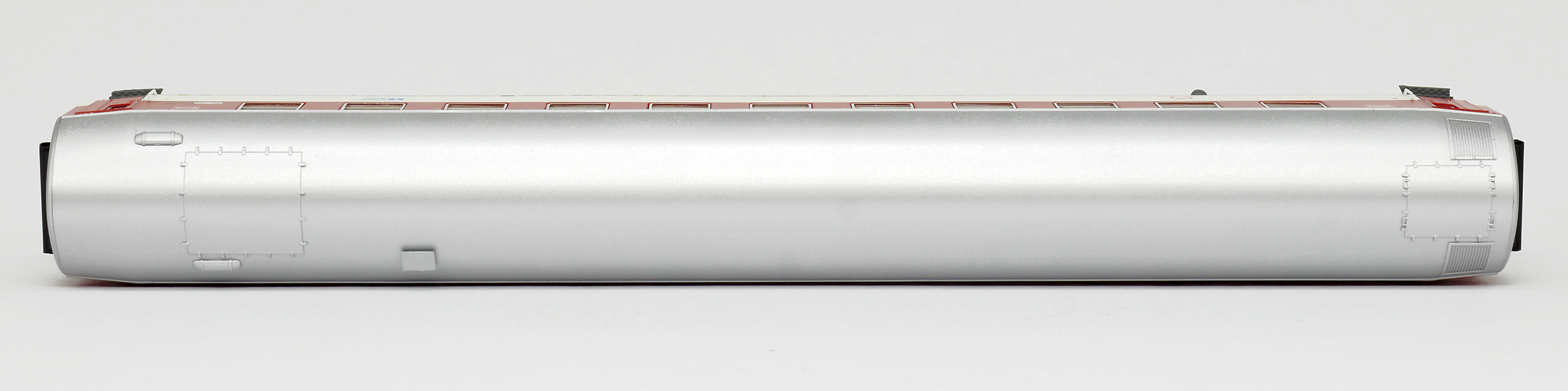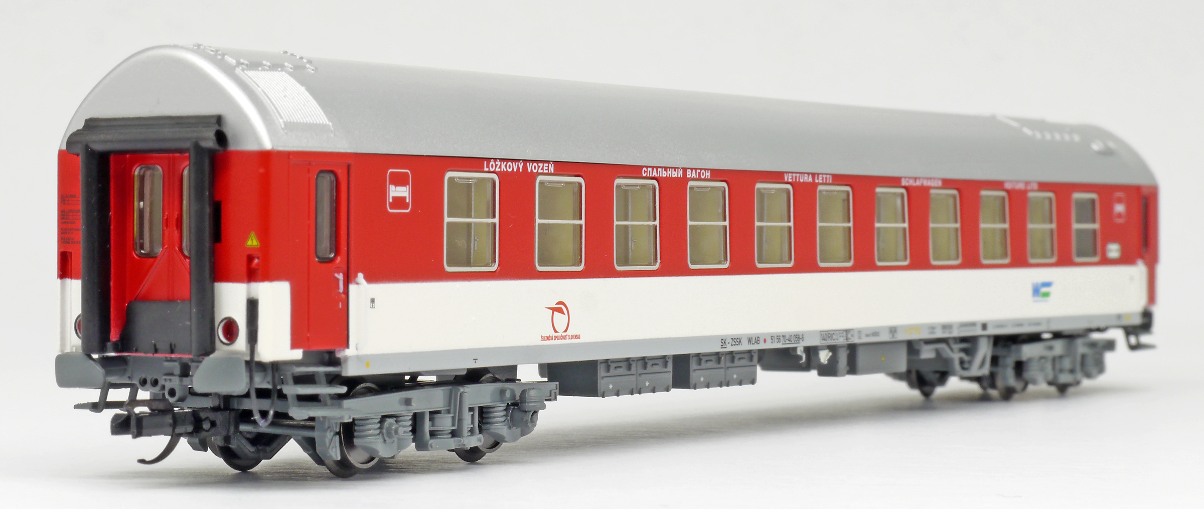 | lůžkový vůz červený-bílý se stříbřitou střechou |