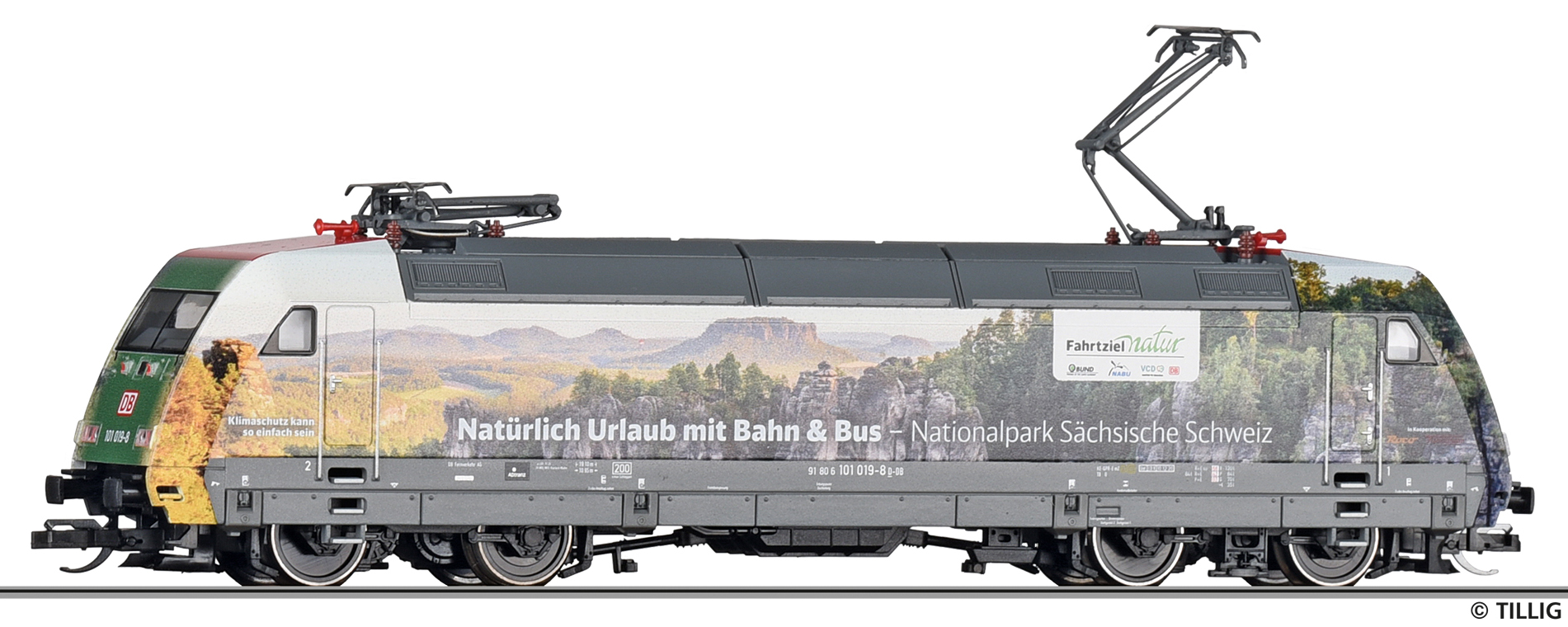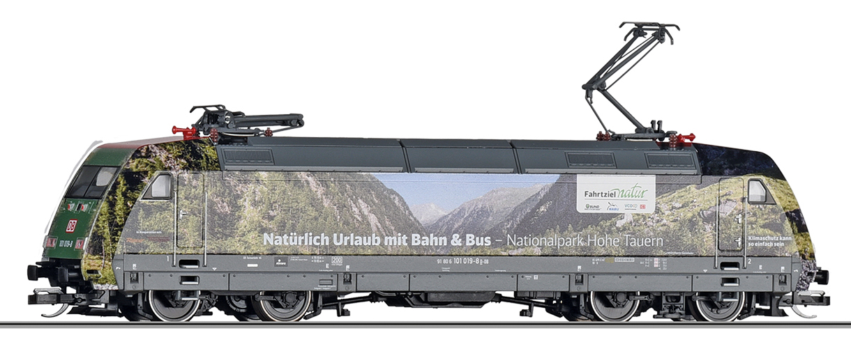 | elektrická lokomotiva v reklamním nátěru „Fahrziel Natur“ |