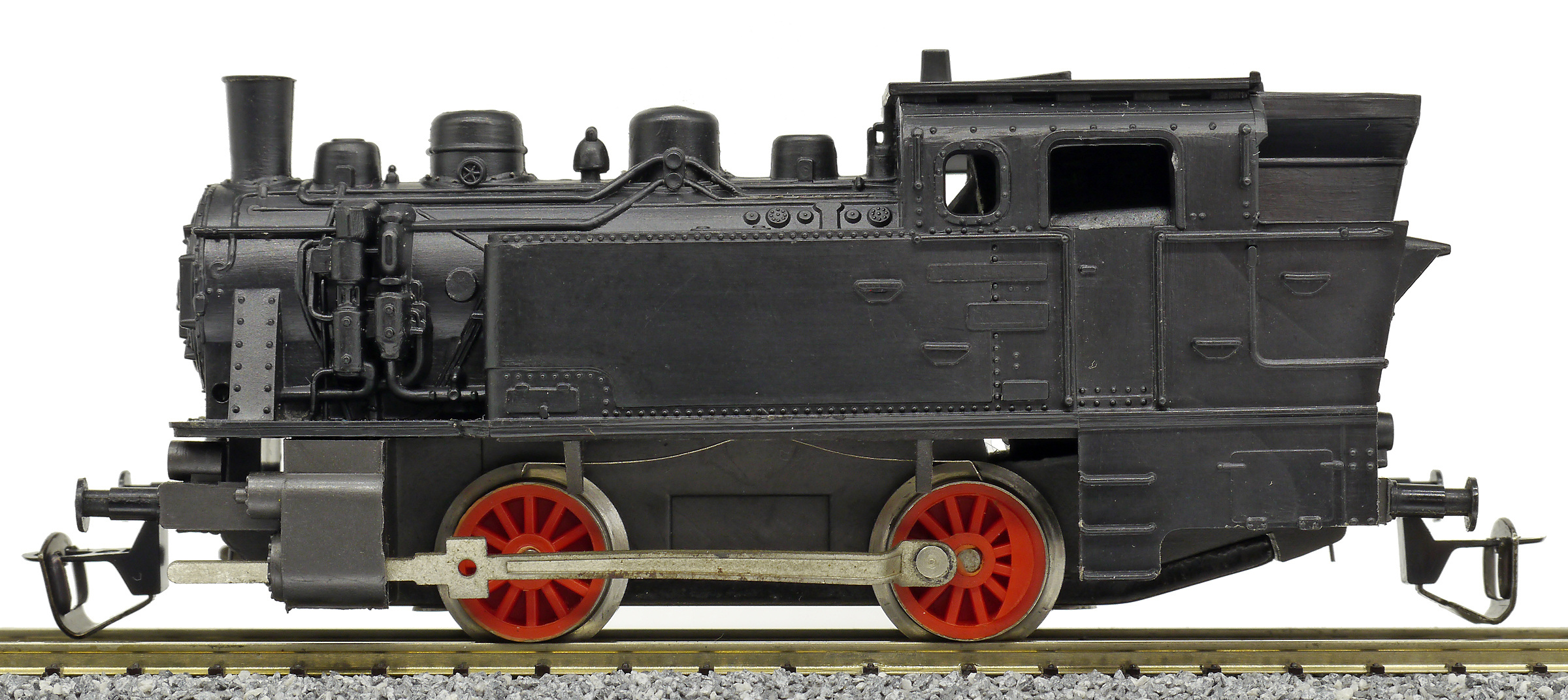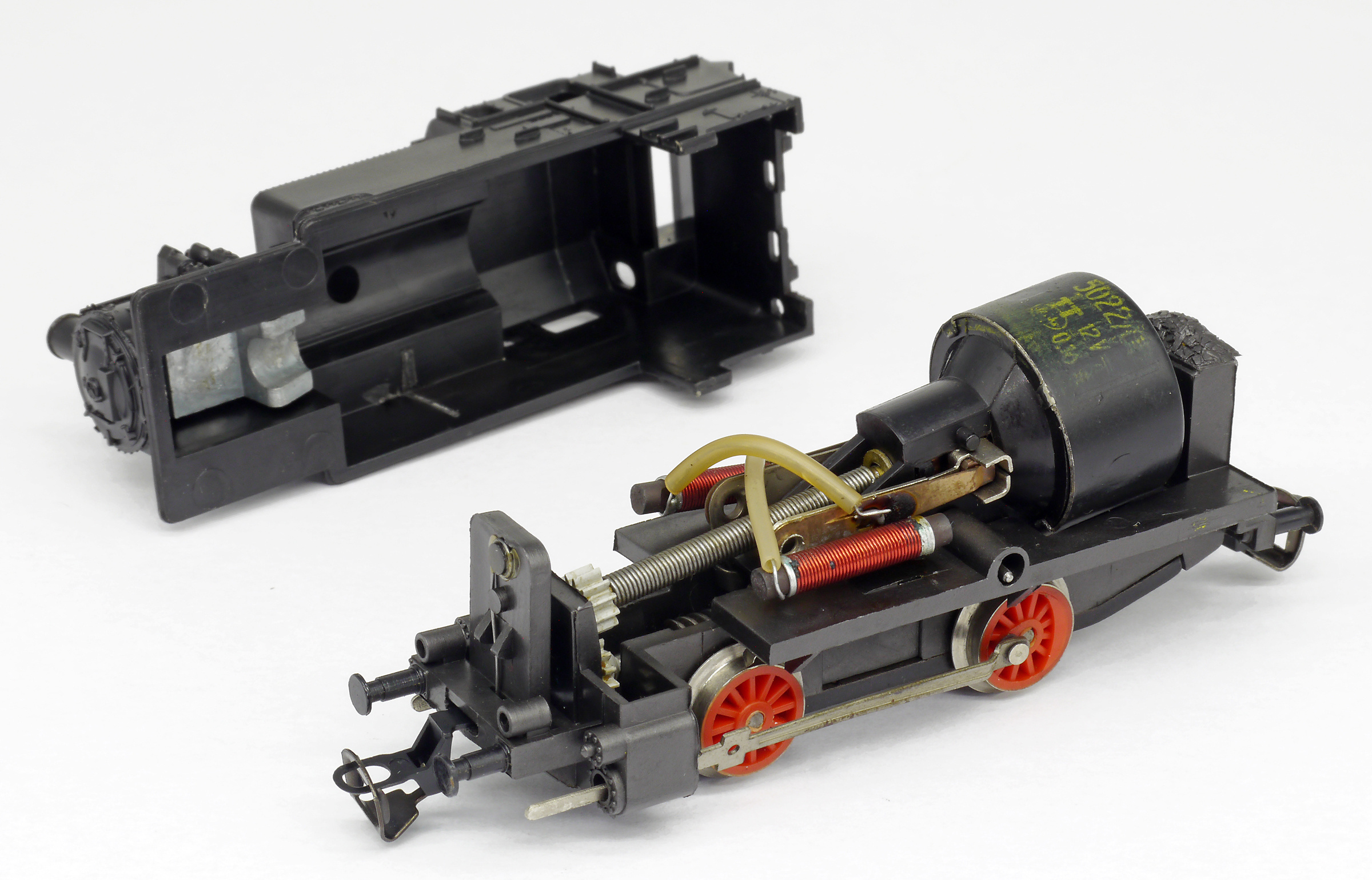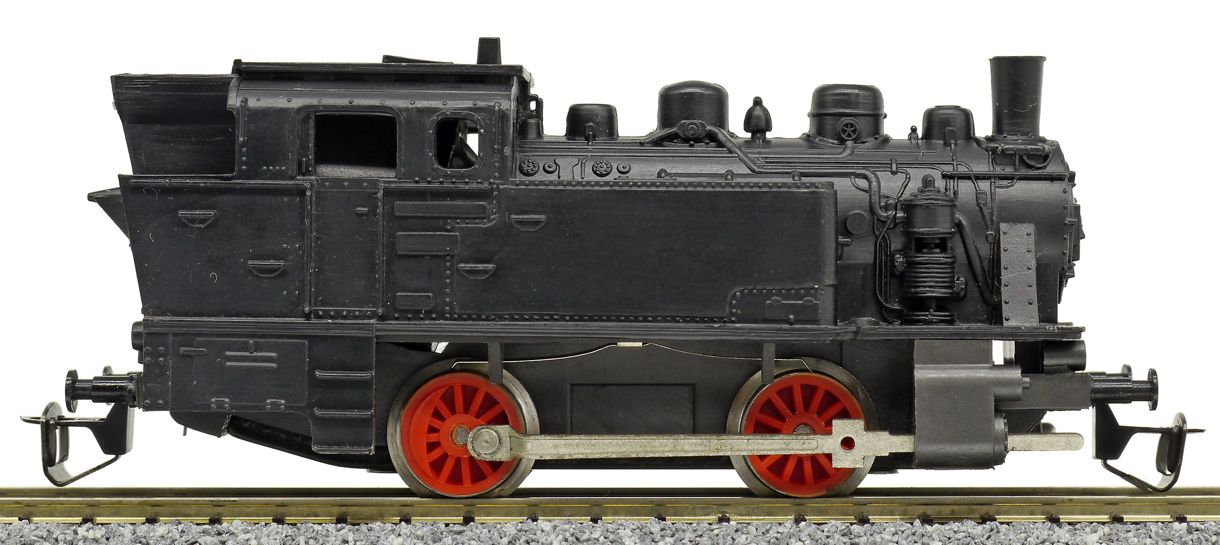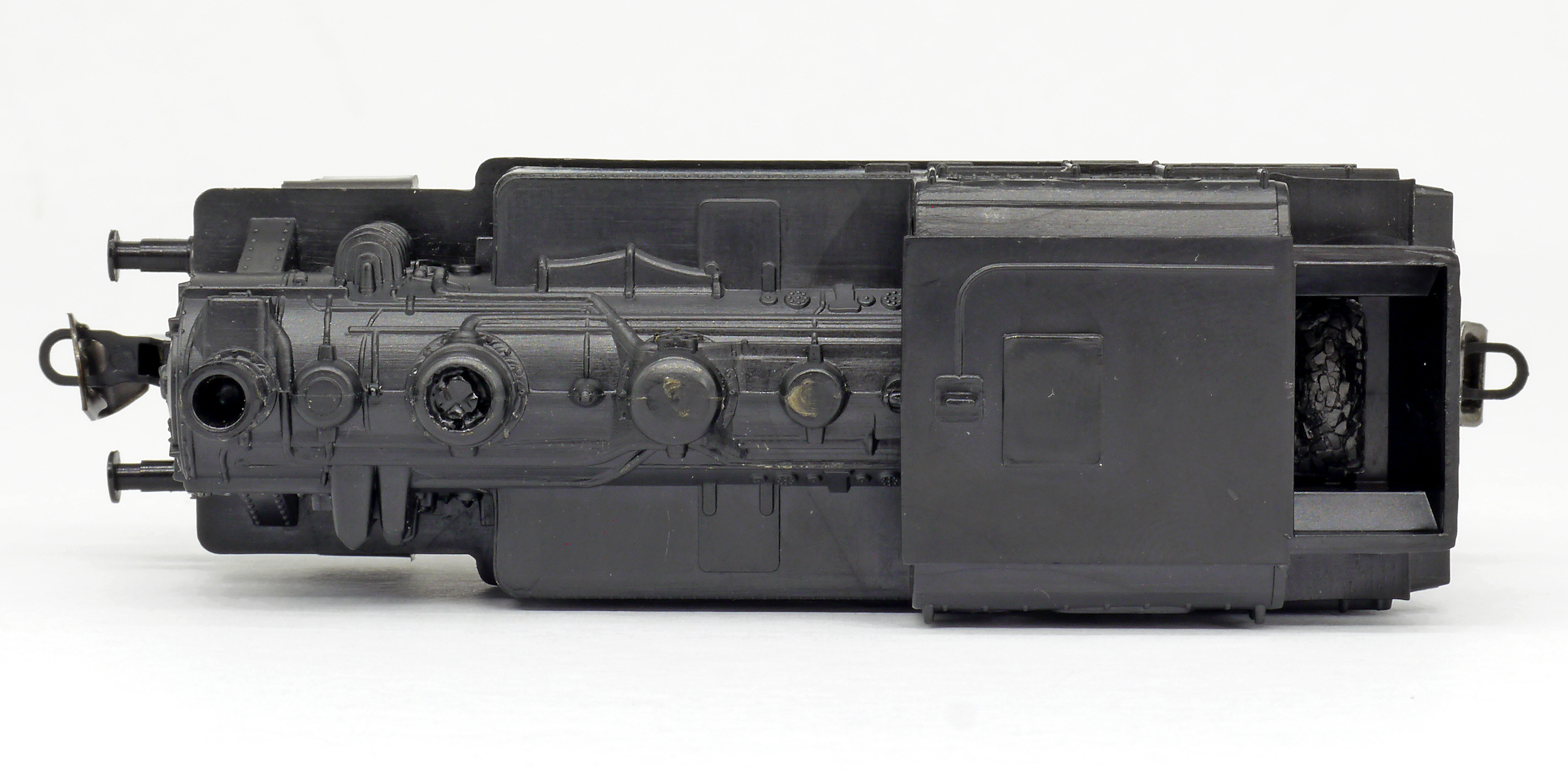 | parní lokomotiva černá v barvě plastu bez potisku, zjednodušený rozvod |