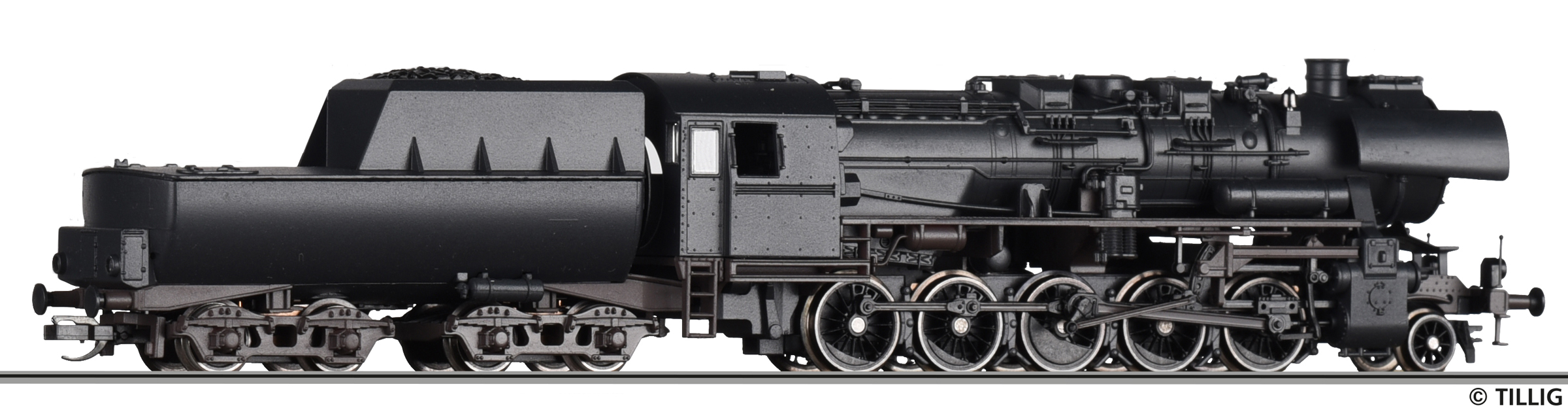 | parní lokomotiva černá s kouřovými plechy, s provozní černohnědou patinou |