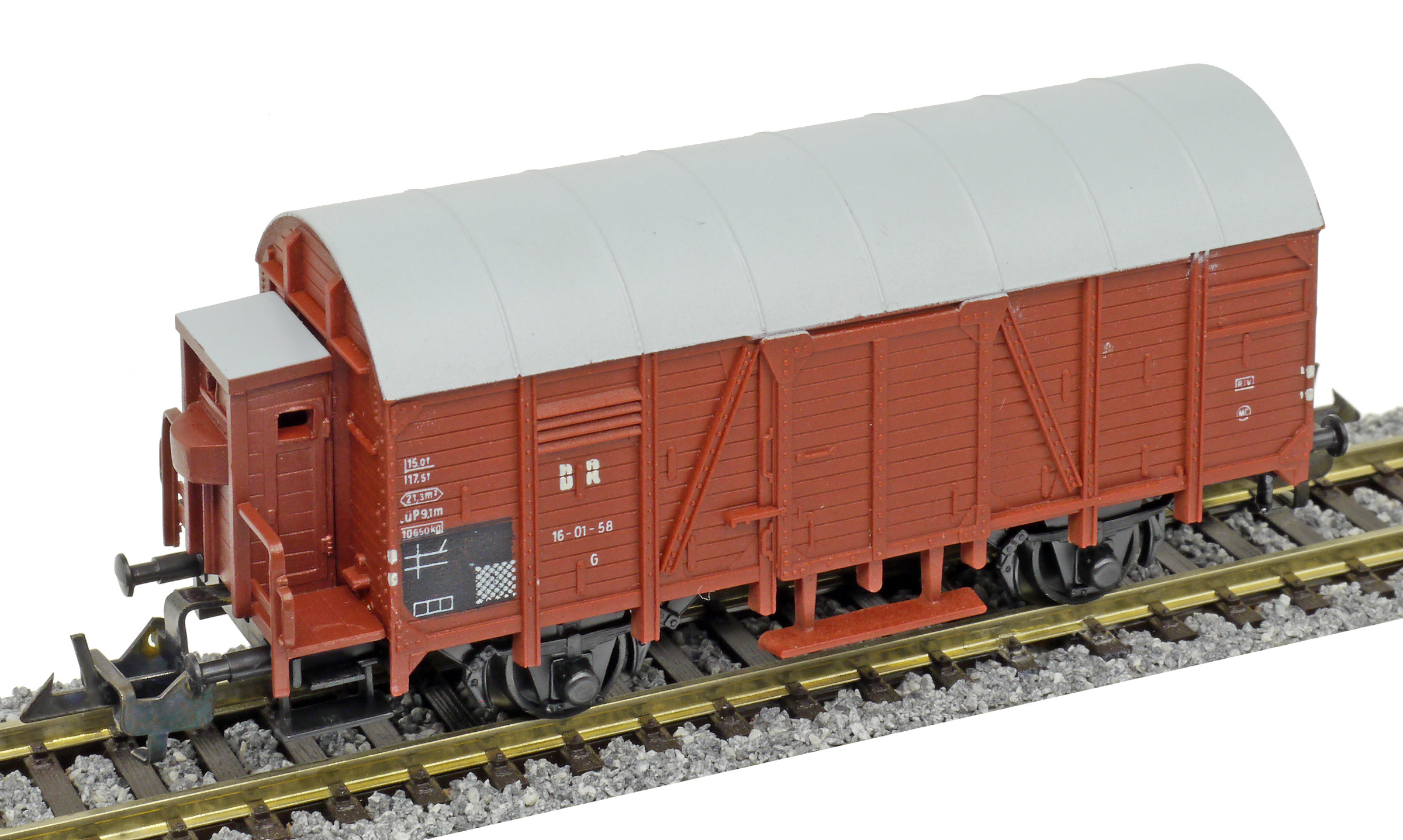 | krytý nákladní vůz červenohnědý s černou střechou a s brzdařskou budkou |