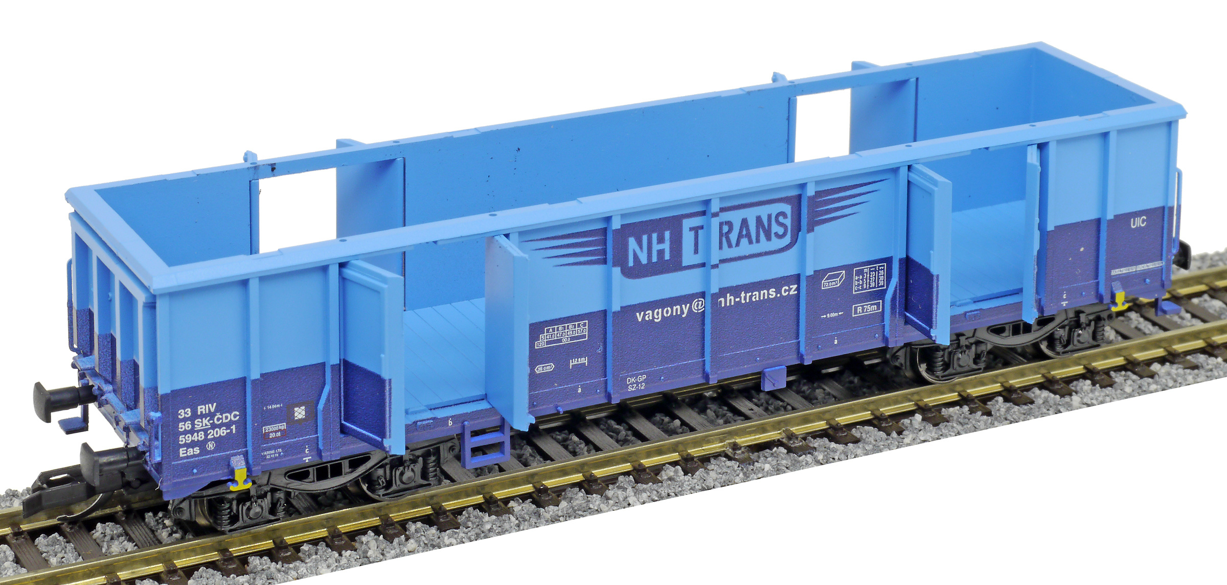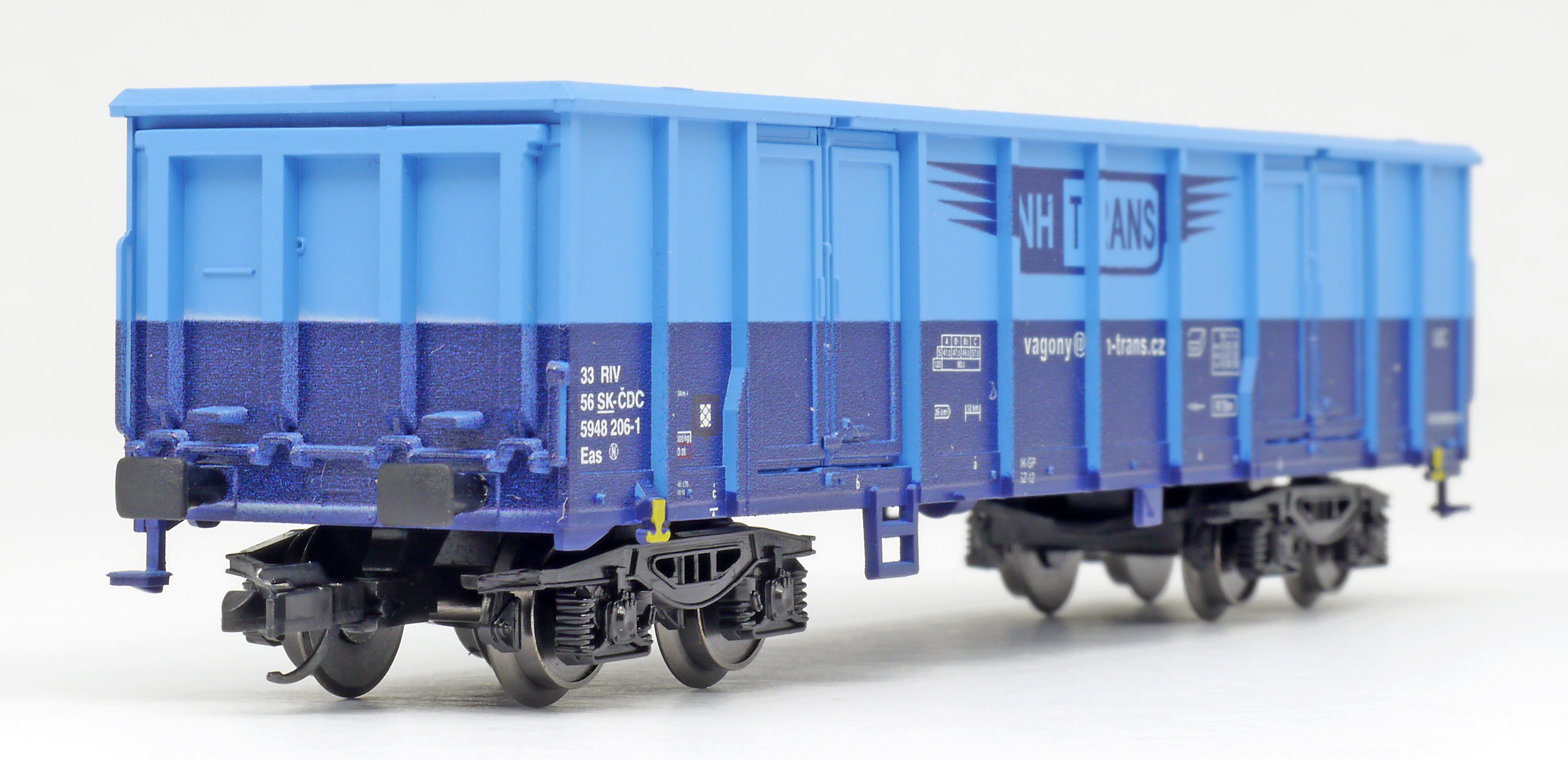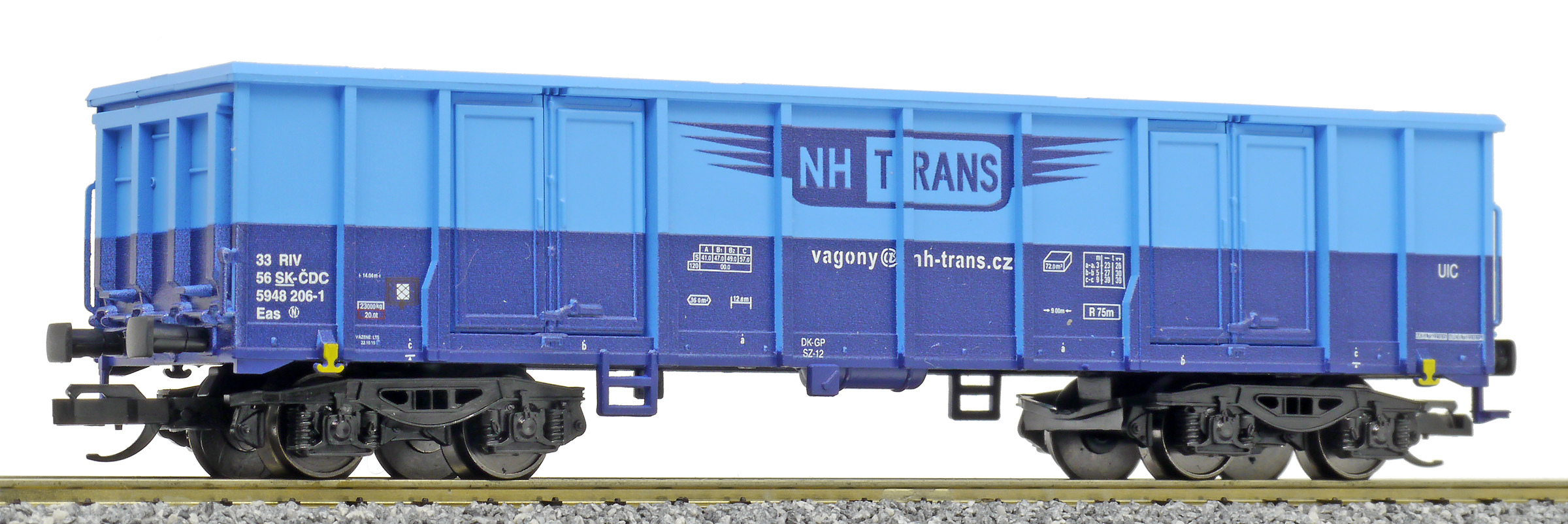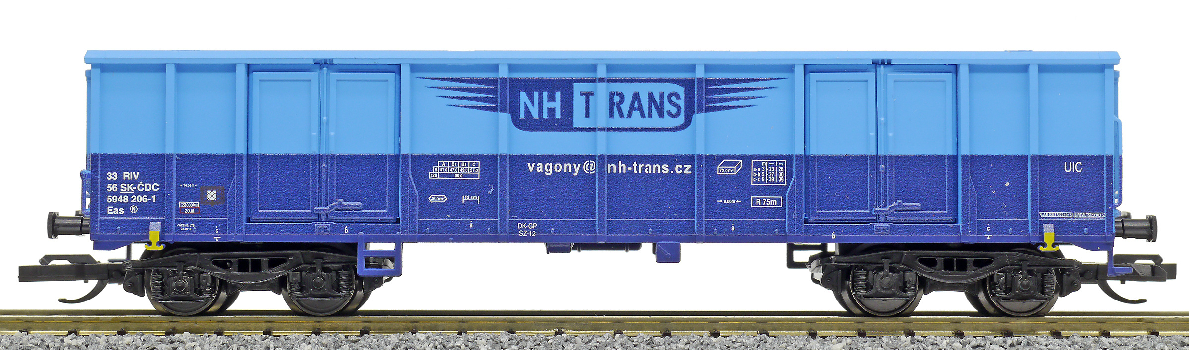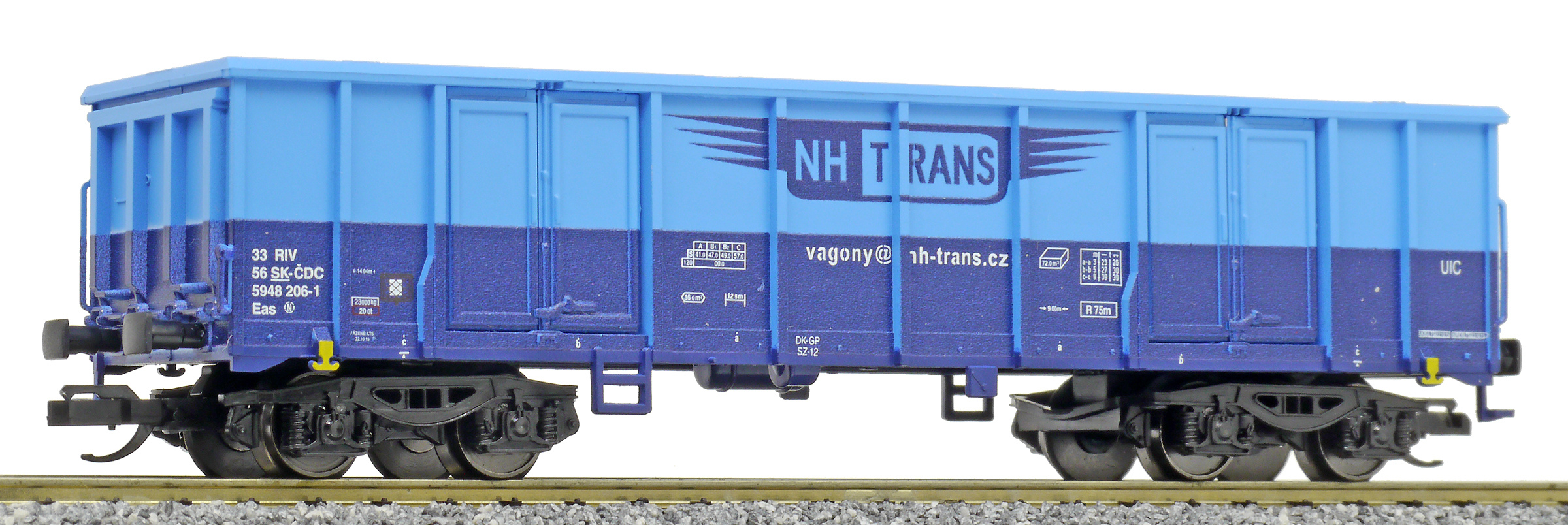 | vysokostěnný nákladní vůz modrý s logem „NH TRANS“ |