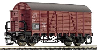 krytý nákladní vůz červenohnědý s tmavě hnědou střechou a s brzdařskou budkou