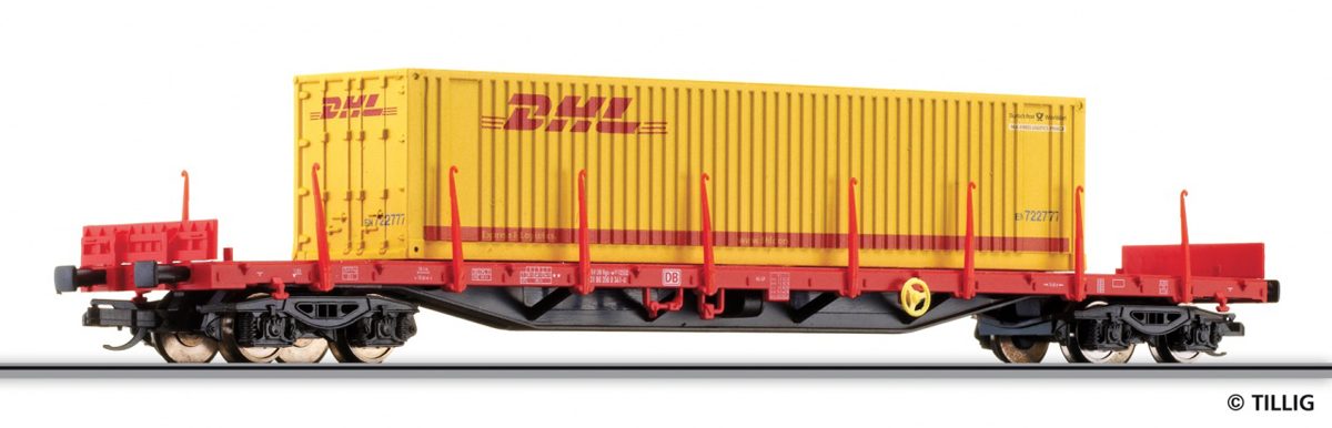 | nákladní plošinový vůz červený s jedním kontejnerem 40' „DHL“ |