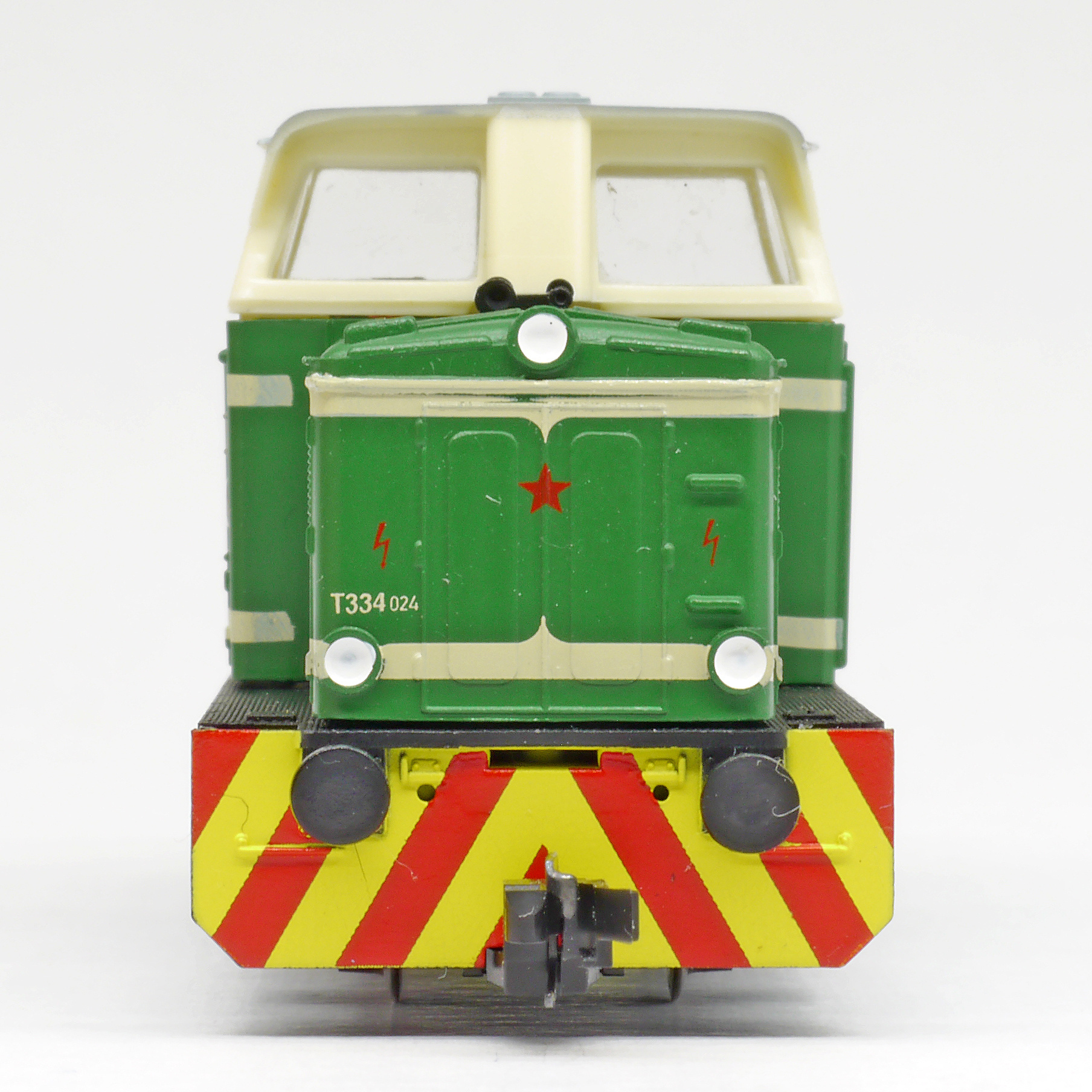 | dieselová lokomotiva zelená s krémovými pruhy, černý rám a šedý pojezd |