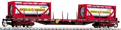 | nákladní plošinový vůz červenohnědý se dvěma cisternovými kontejnery „BERTSCHI“ |