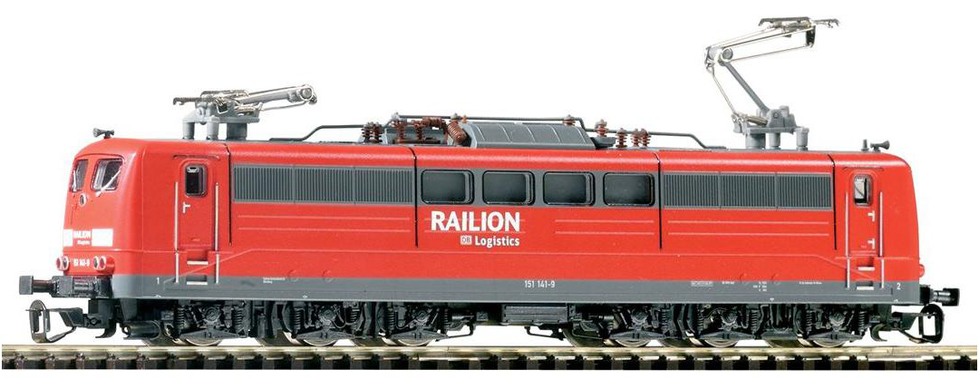 | elektrická lokomotiva červená s šedým rámem „Railion” |