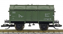 | nákladní vůz tmavě zelený s klapkami, černý pojezd, na uhlí do pracovního vlaku |