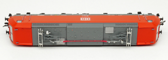 | elektrická lokomotiva červená s šedým rámem a černým pojezdem |