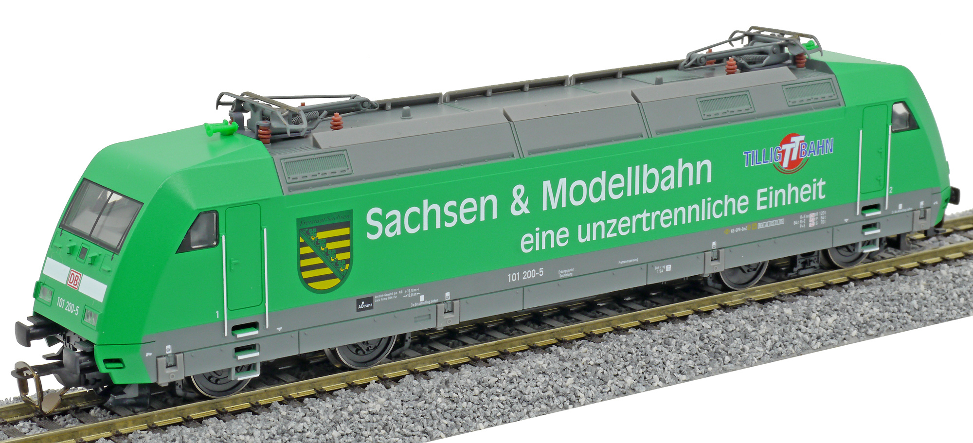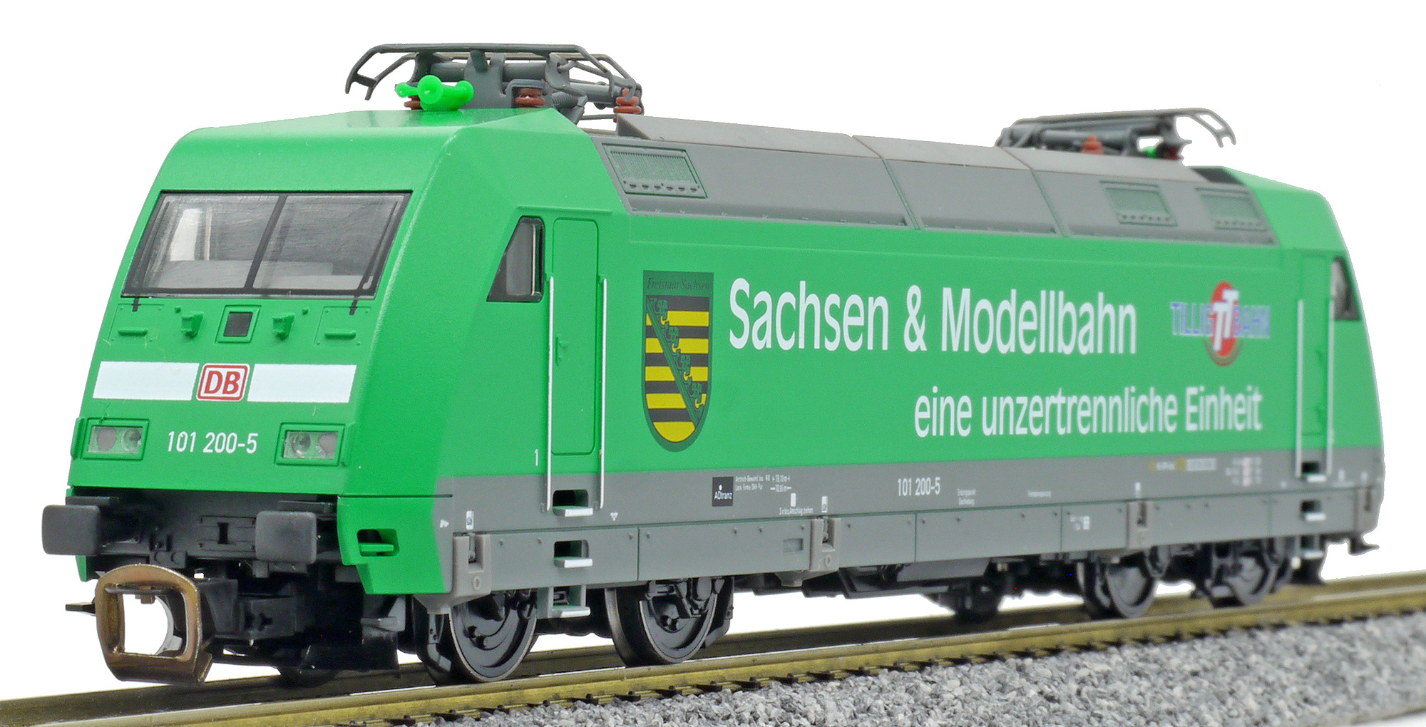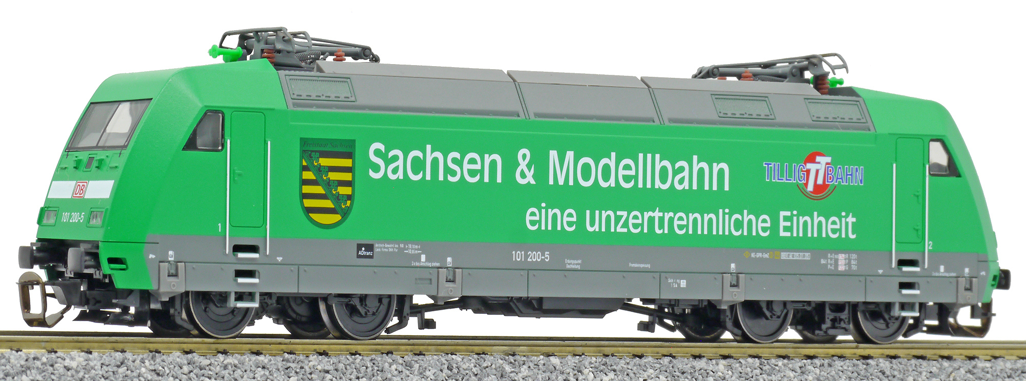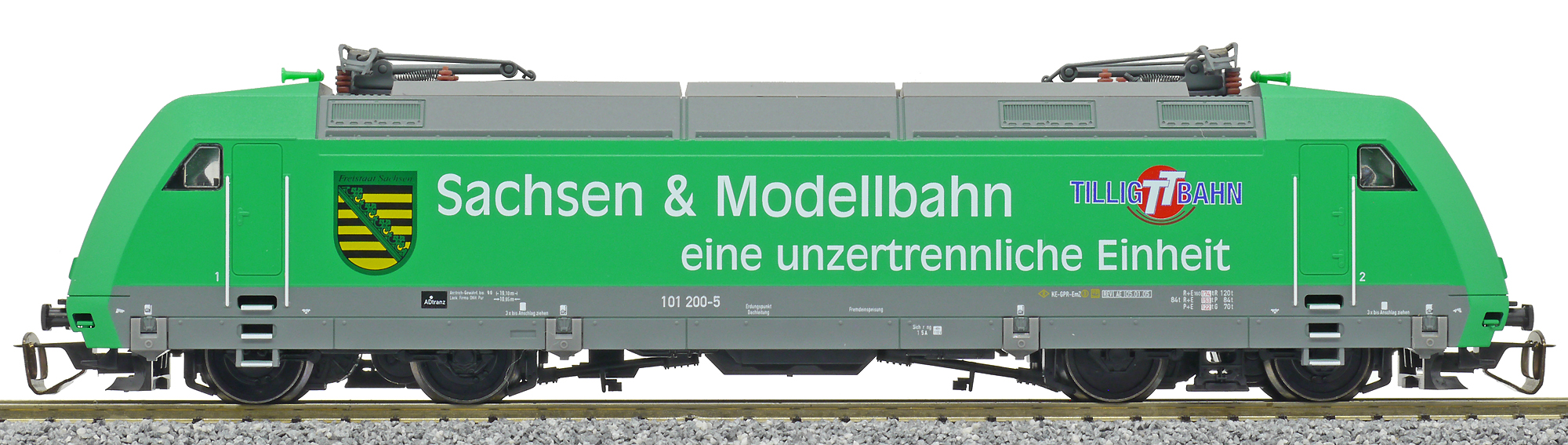 Popis   elektrická lokomotiva zelená s reklamním potiskem „Sachsen/Tllig“