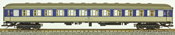 rychlíkový vůz modrý s bílým pásem a šedou střechou 2. tř.