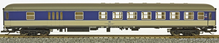 rychlíkový vůz se zavazadlovým oddílem modrý s bílým pásem a šedou střechou 2. tř.