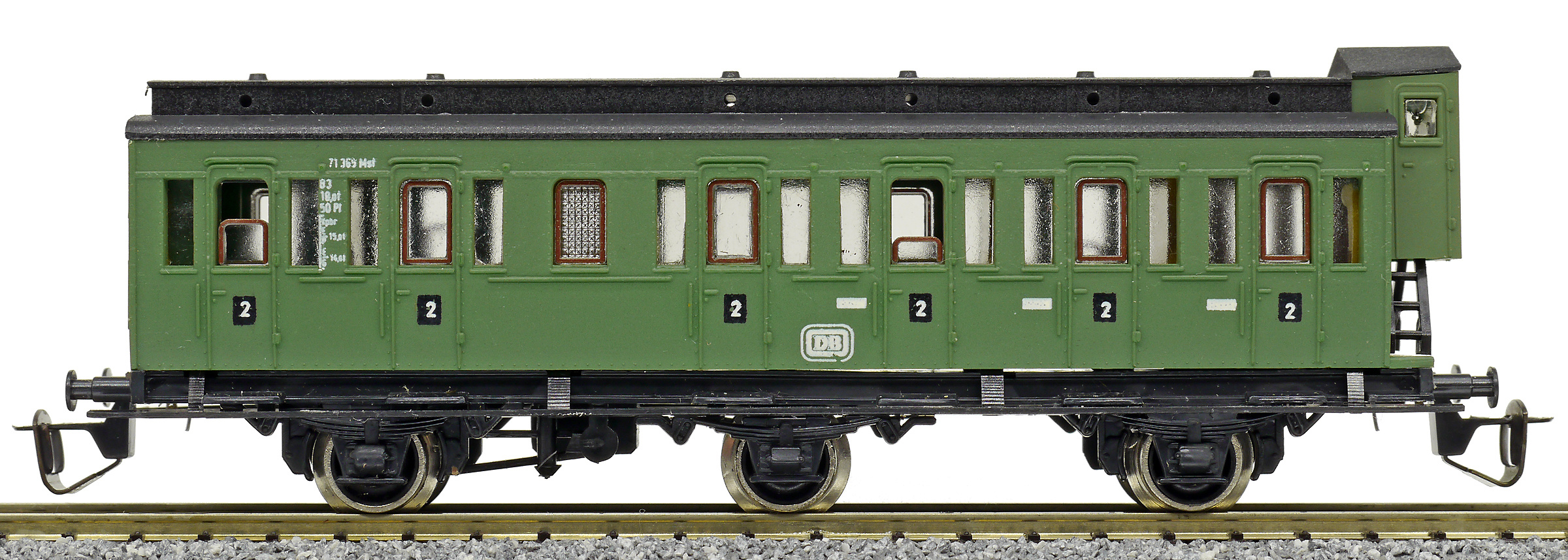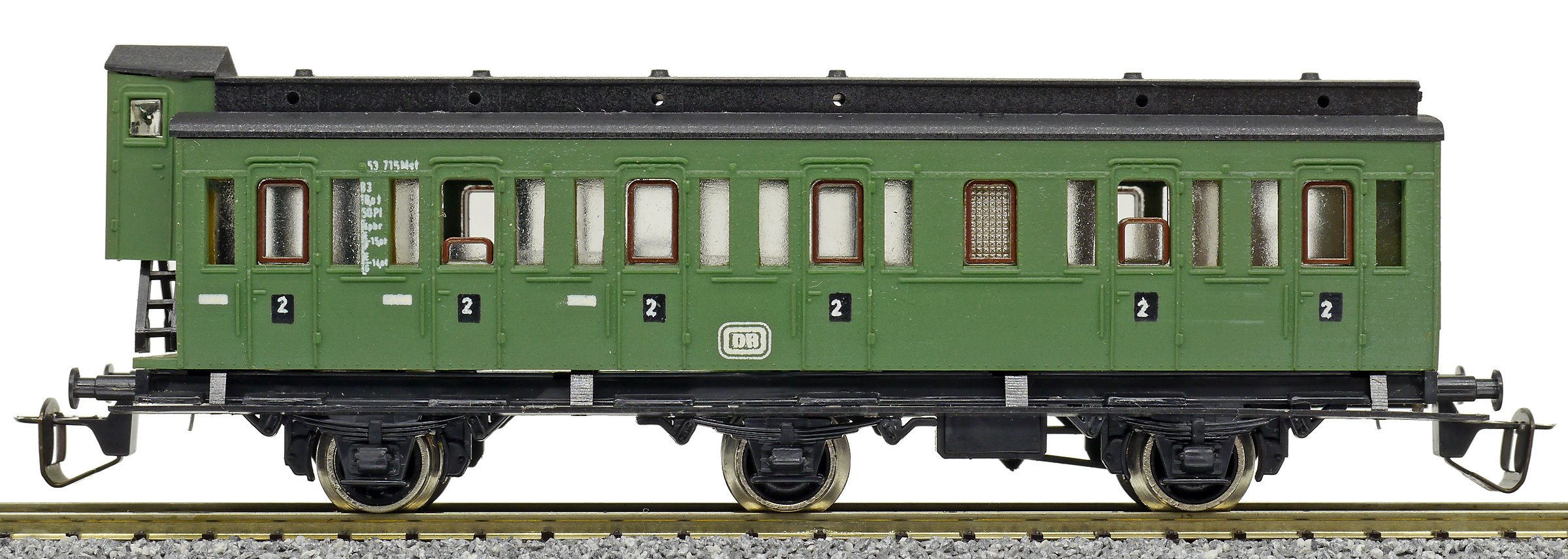 oddílový osobní vůz zelený s černou střechou a s brzdařskou budkou 2. tř.