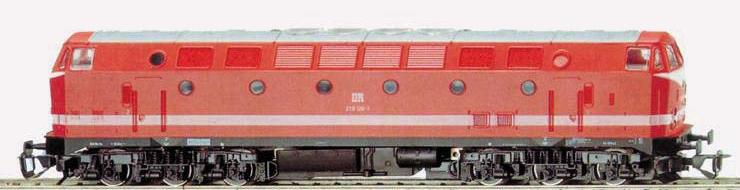 Popis   dieselová lokomotiva červená s bílým pruhem a černým pojezdem