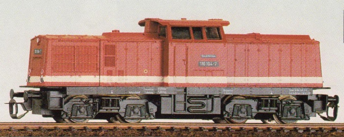 dieselová lokomotiva červená s bílým pruhem, černým rámem a podvozky