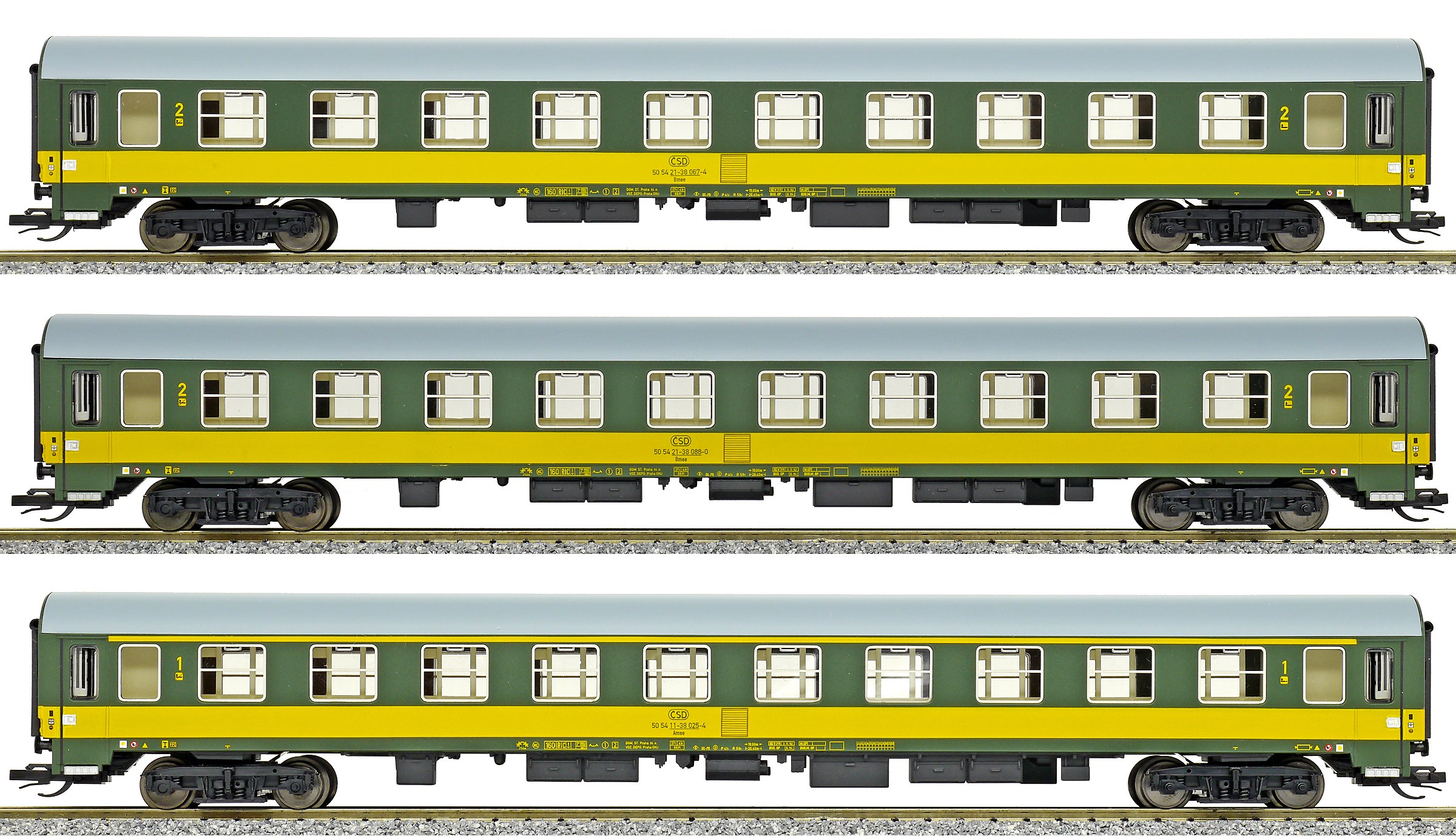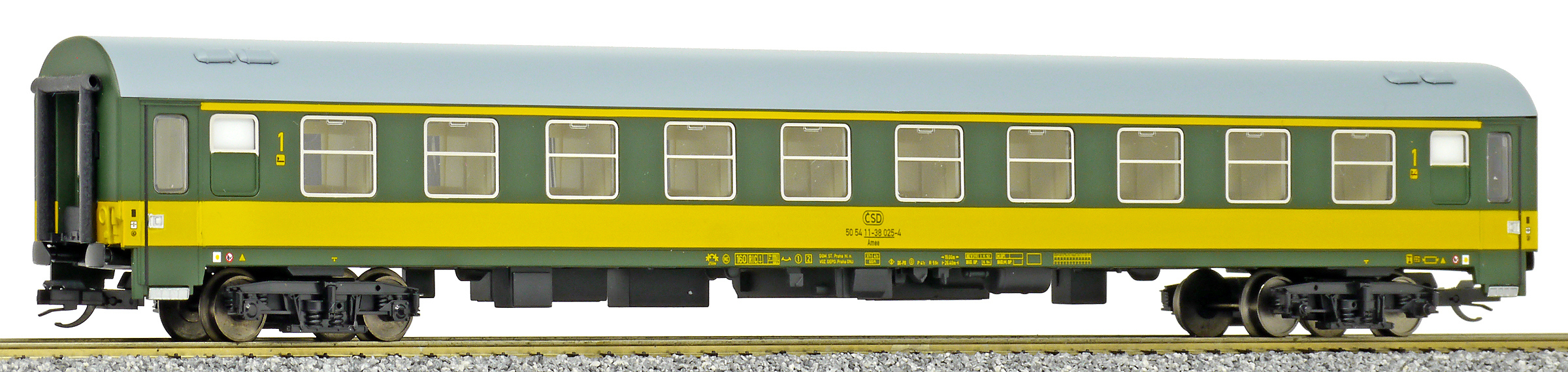 | rychlíkový vůz zelený se žlutým pruhem a šedou střechou 1. tř. |