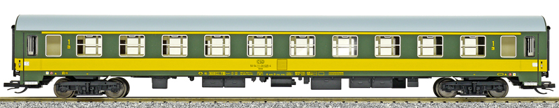 | rychlíkový vůz zelený se žlutým pruhem a šedou střechou 1. tř. |
