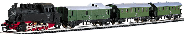 set parní lokomotivy BR 81, jednoho zavazadlového a dvou osobních vozů