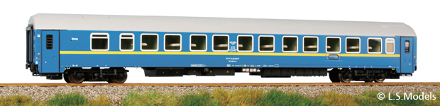 lůžkový vůz modrý se žlutým pruhem a světle šedou střechou