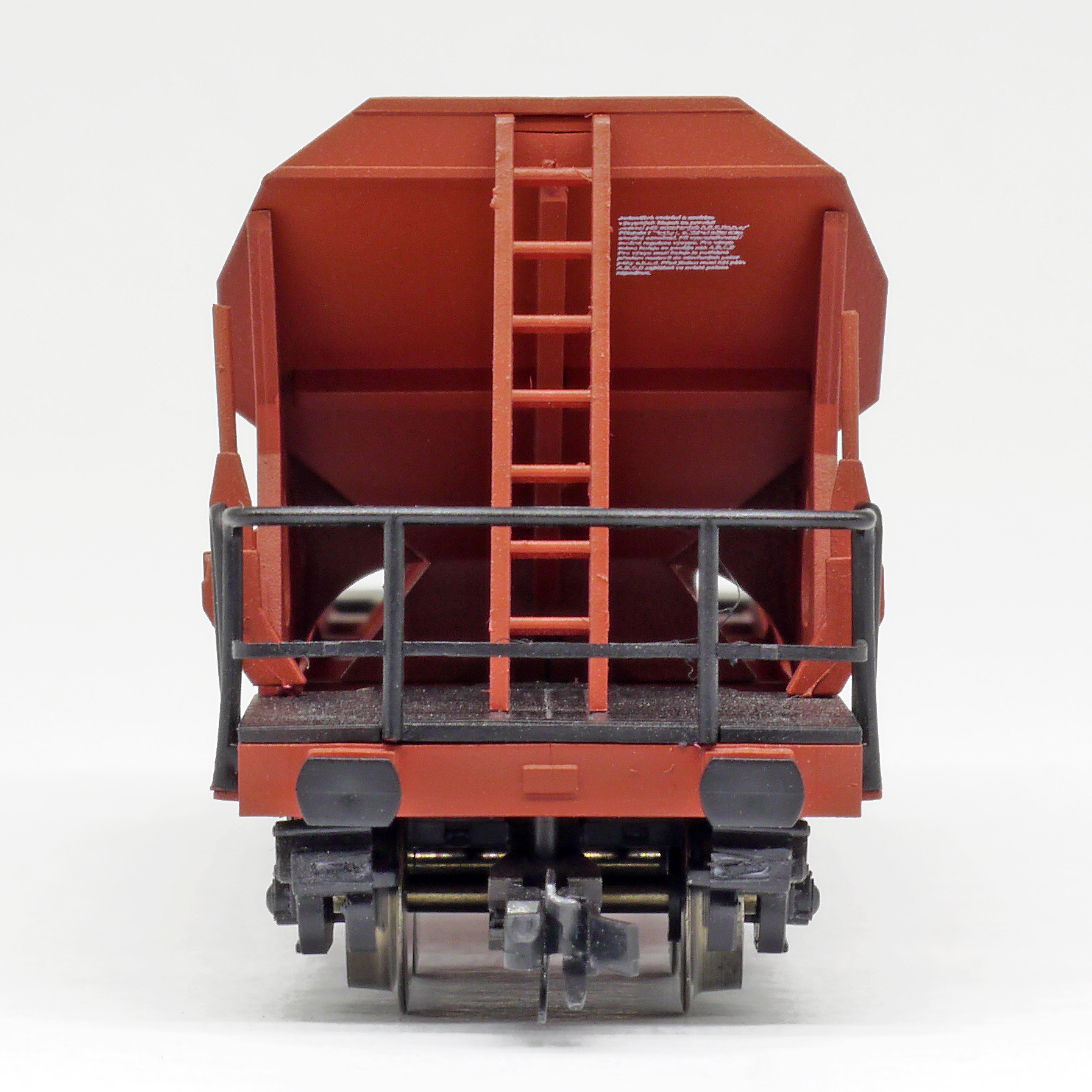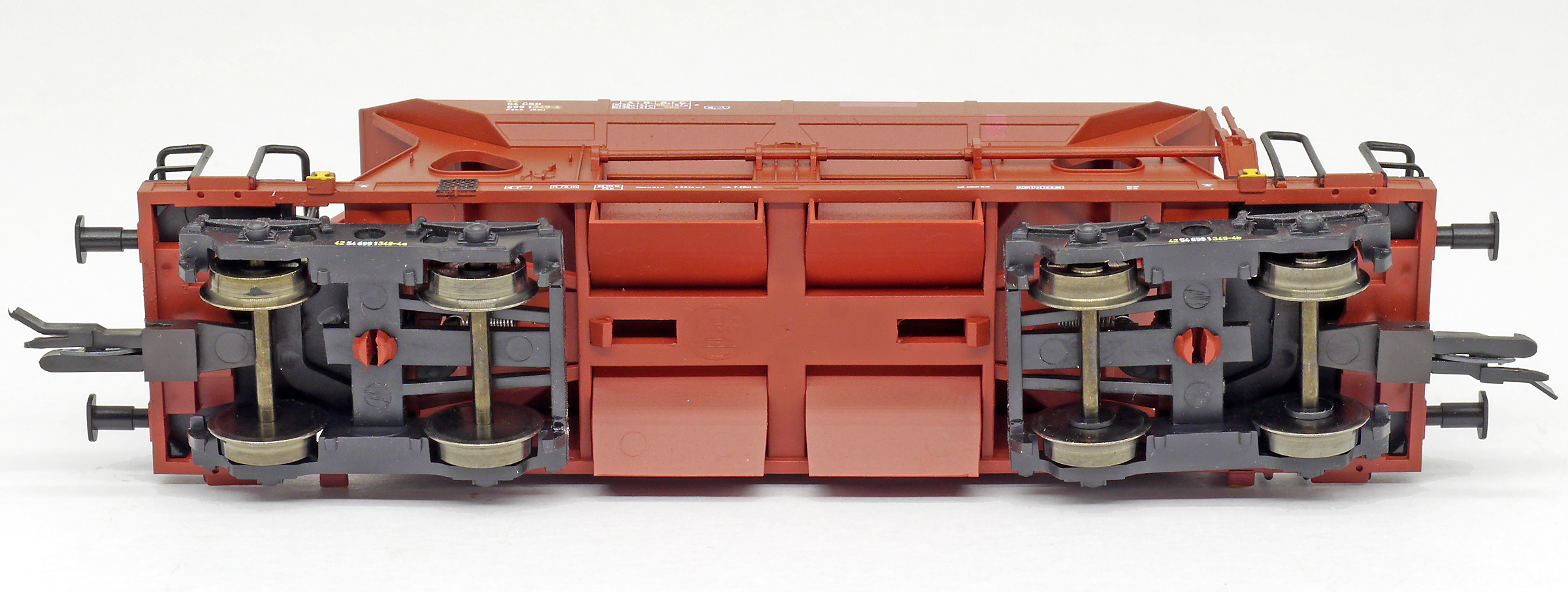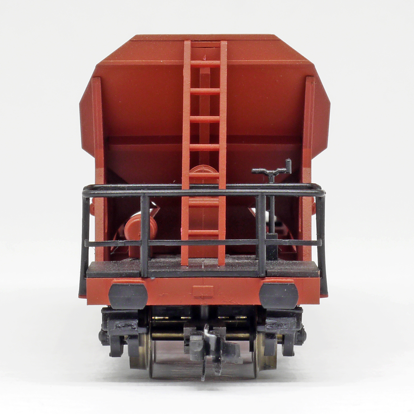 | nákladní samovýsypný vůz červenohnědý s černými plošinami |