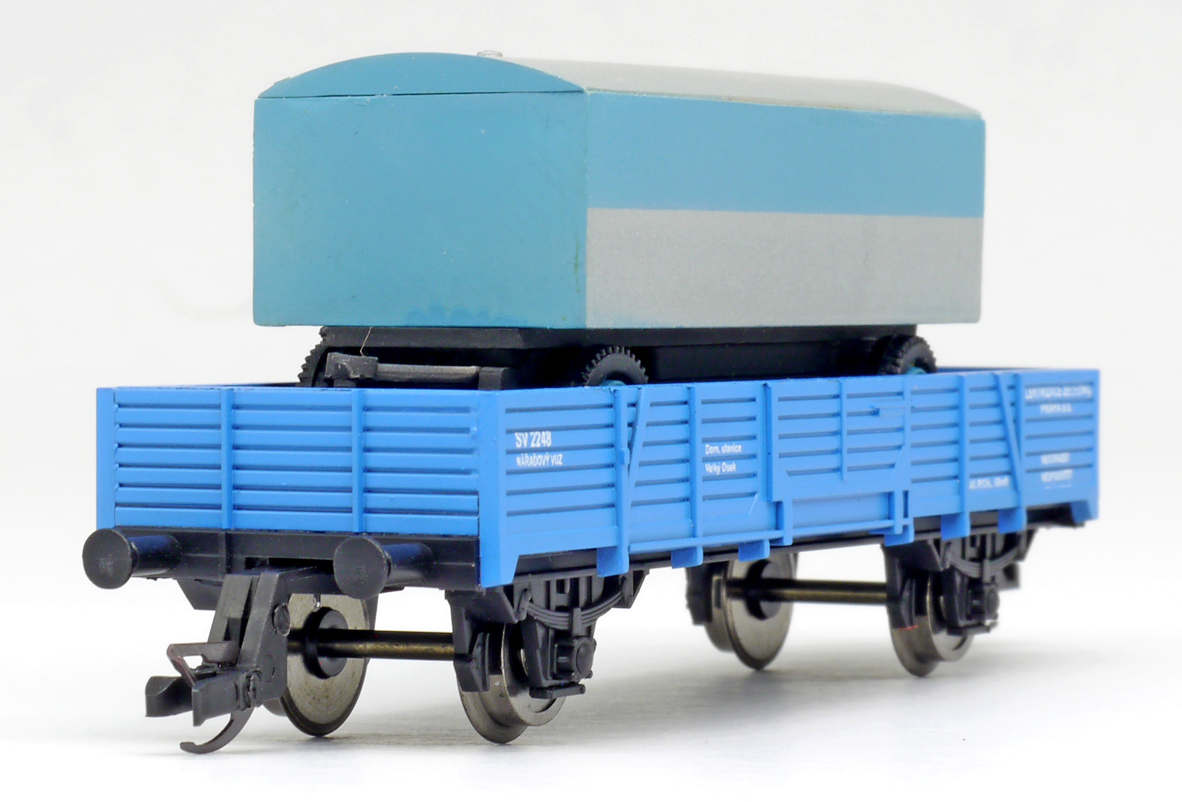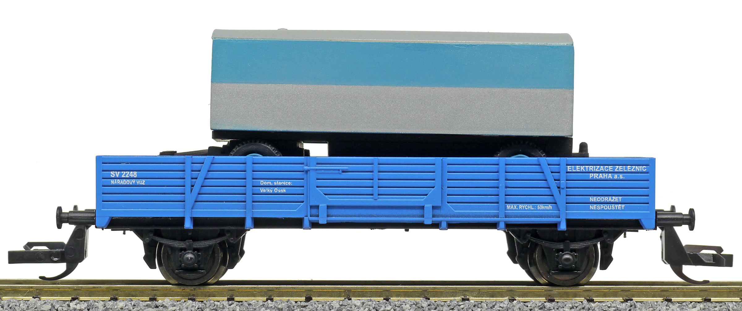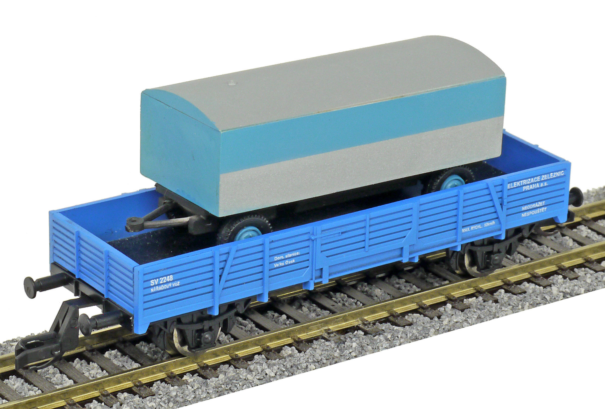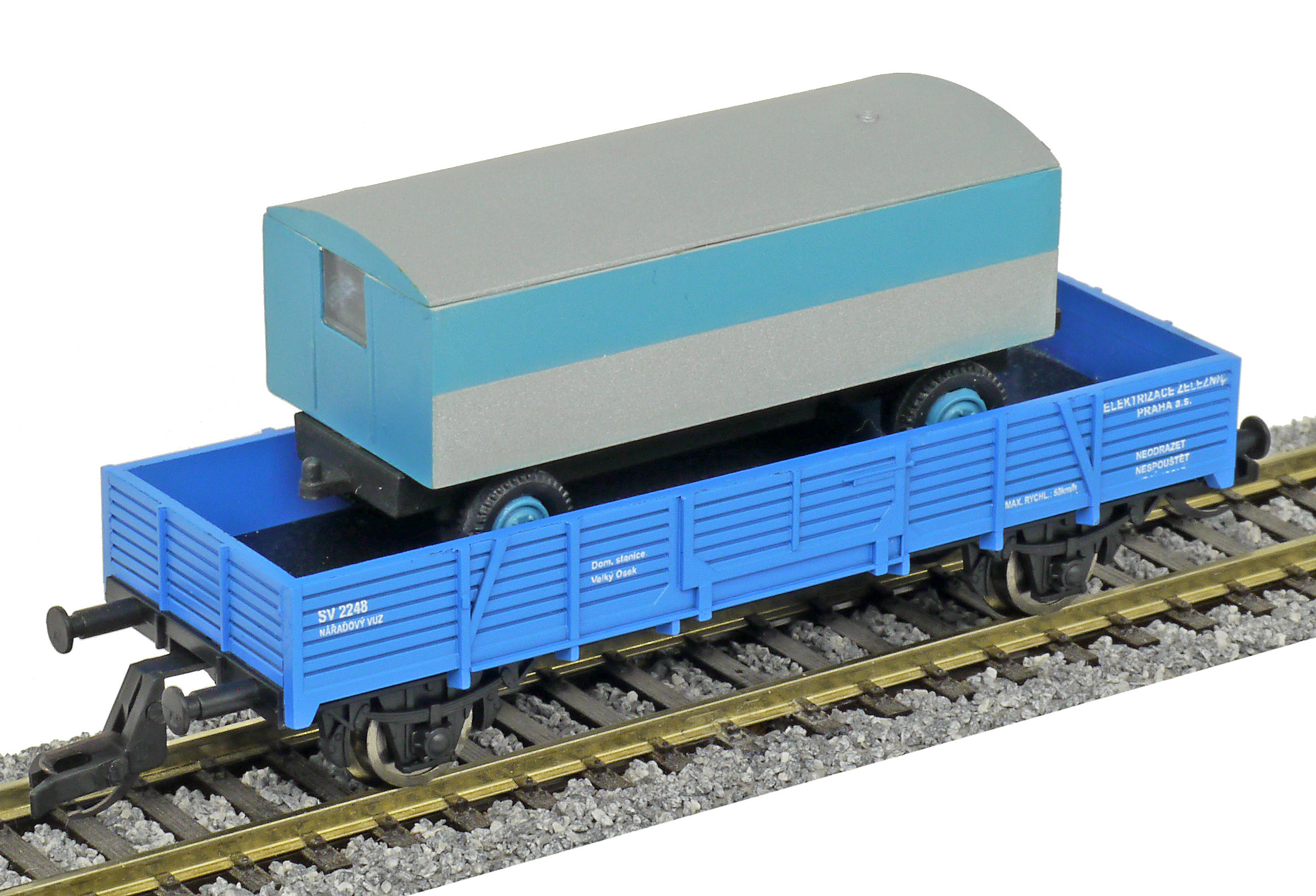 | nízkostěnný nářaďový vůz modrý s nákladem maringotky „Elektrizace železnic“ |