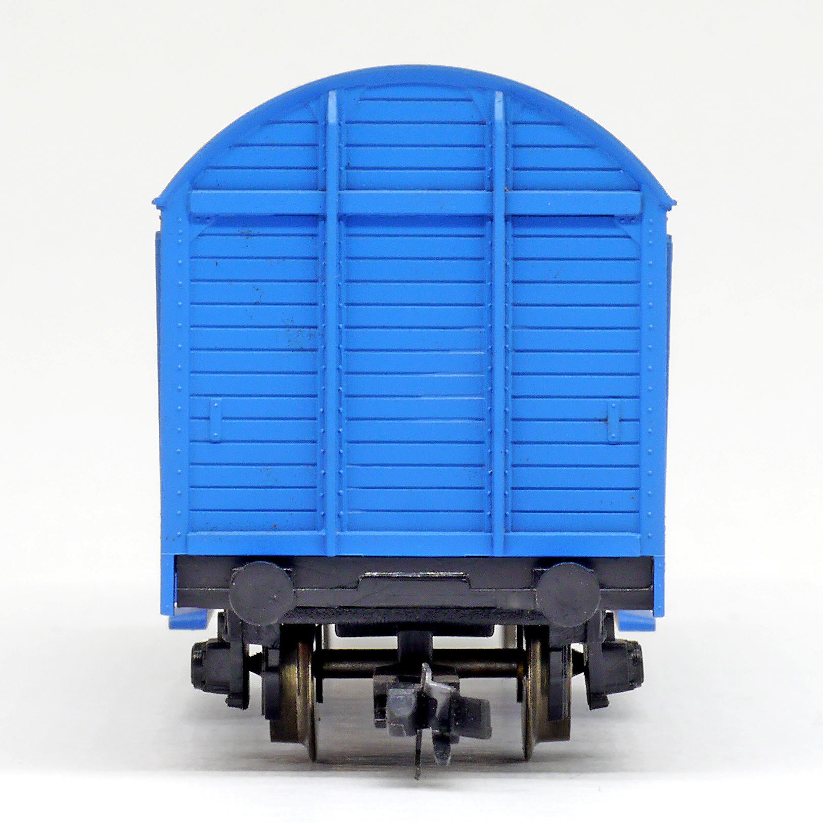 | krytý nákladní vůz modrý s šedou střechou a stříbrnými vraty dílenský vůz „Elektrizace železnic“ |