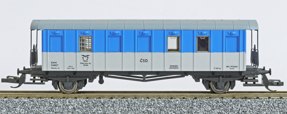 | modrý-stříbrný s šedou střechou dílenský vůz "Elektrizace železnic" (E |