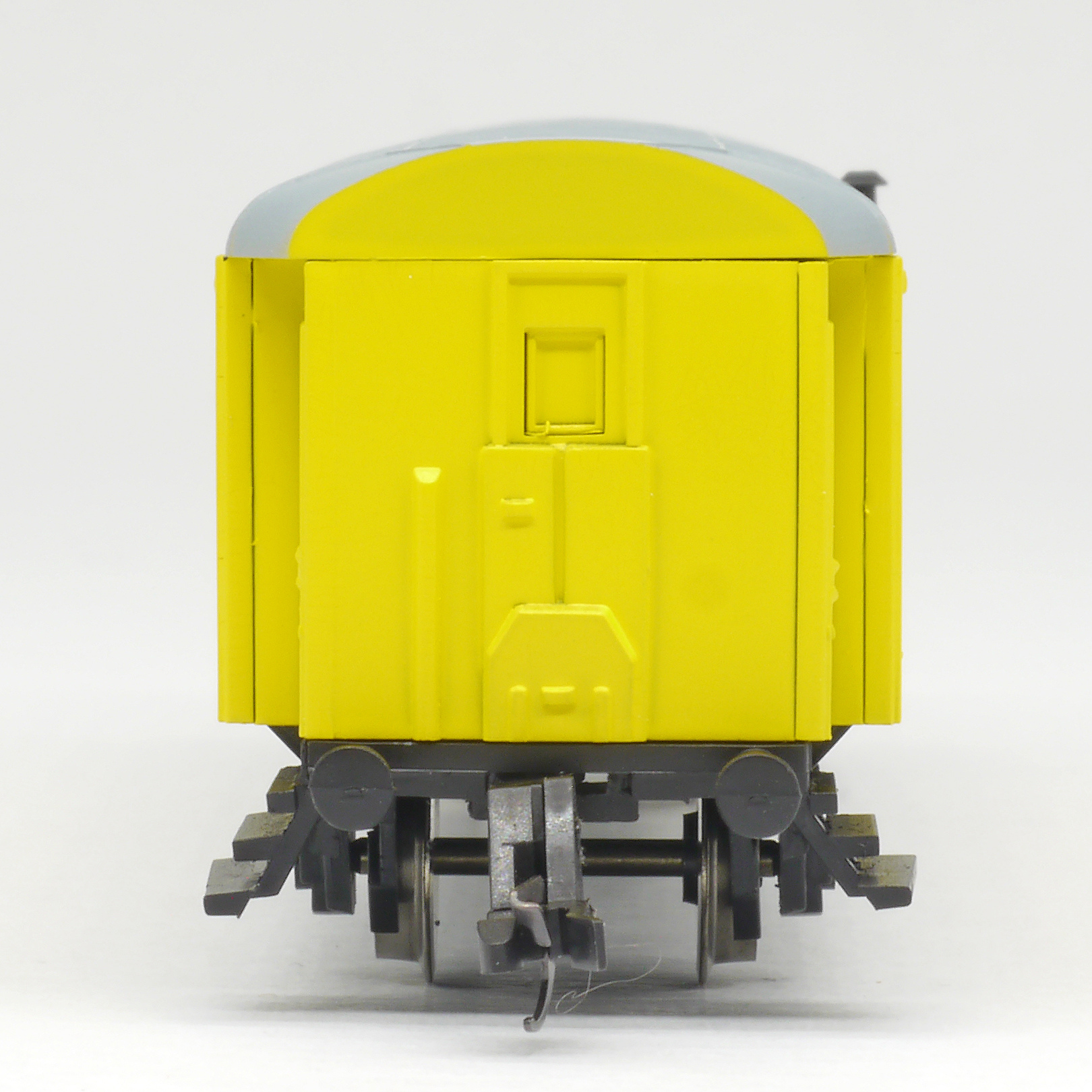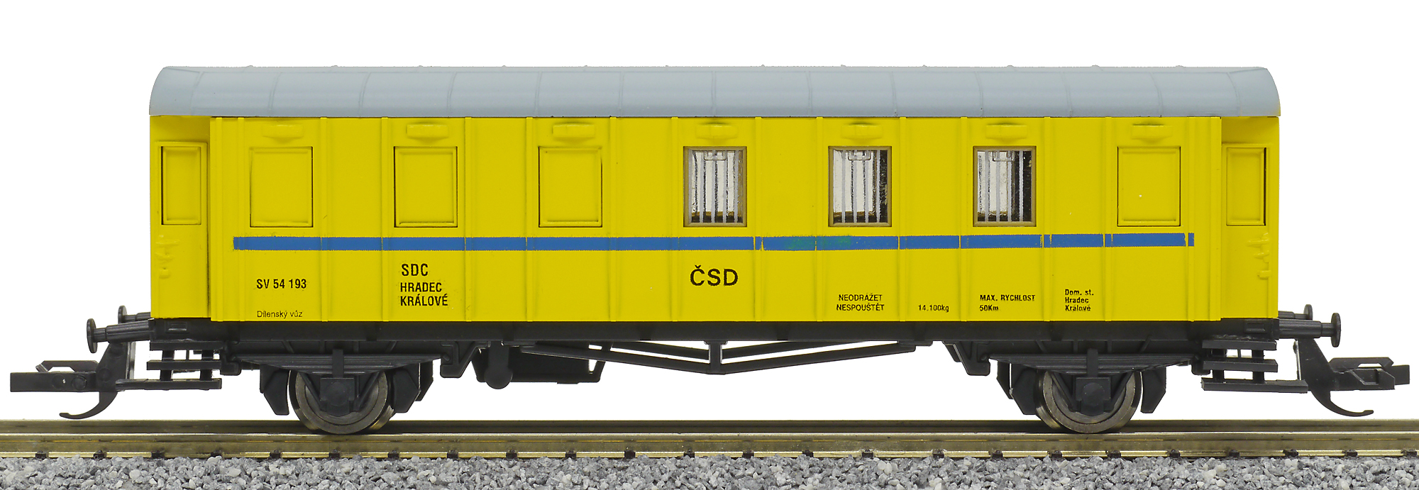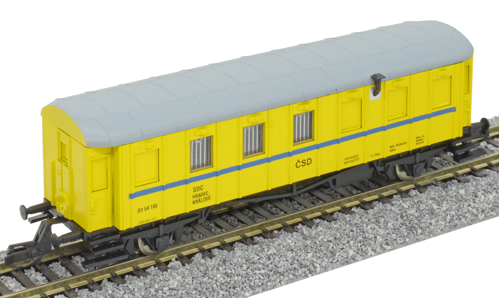 | dílenský vůz žlutý modrým proužkem a šedou střechou |