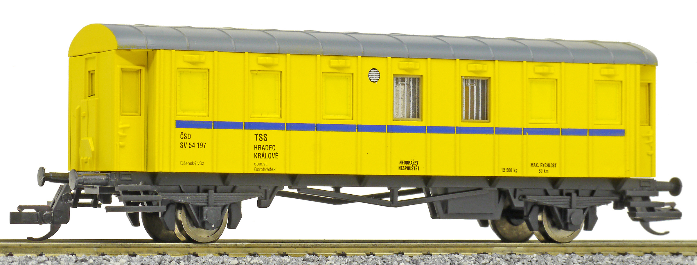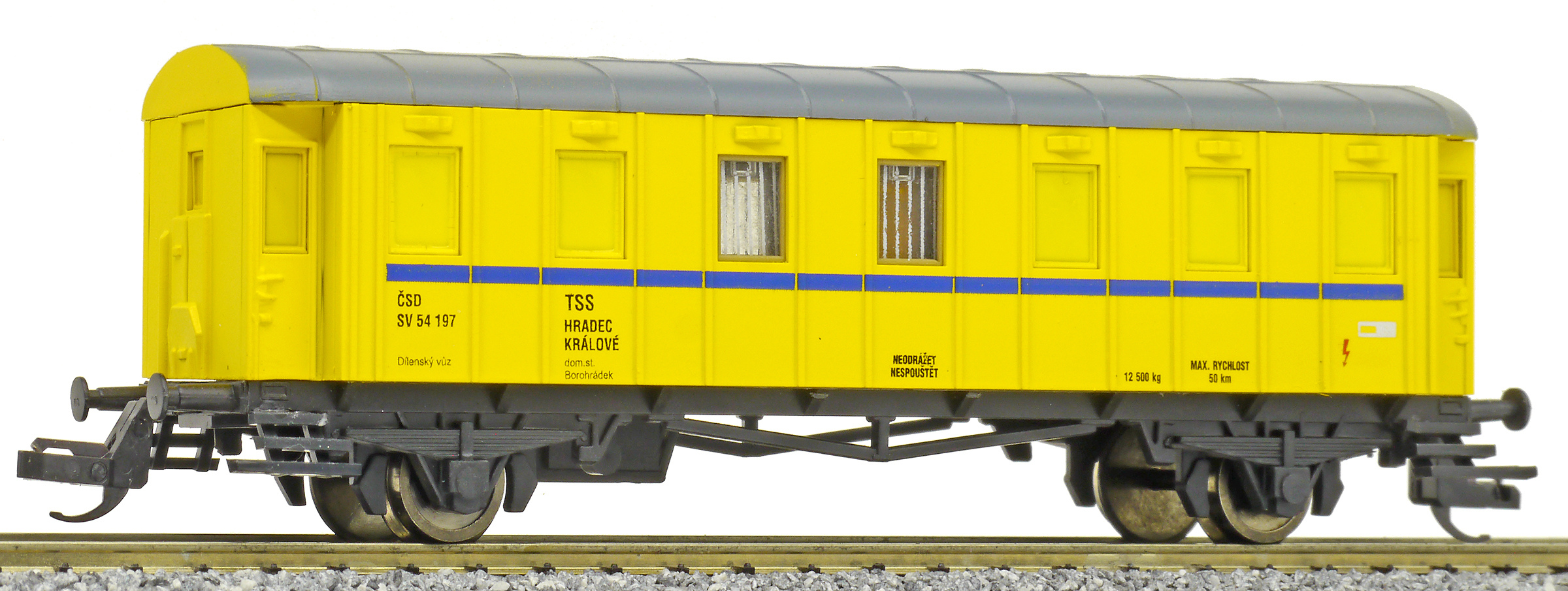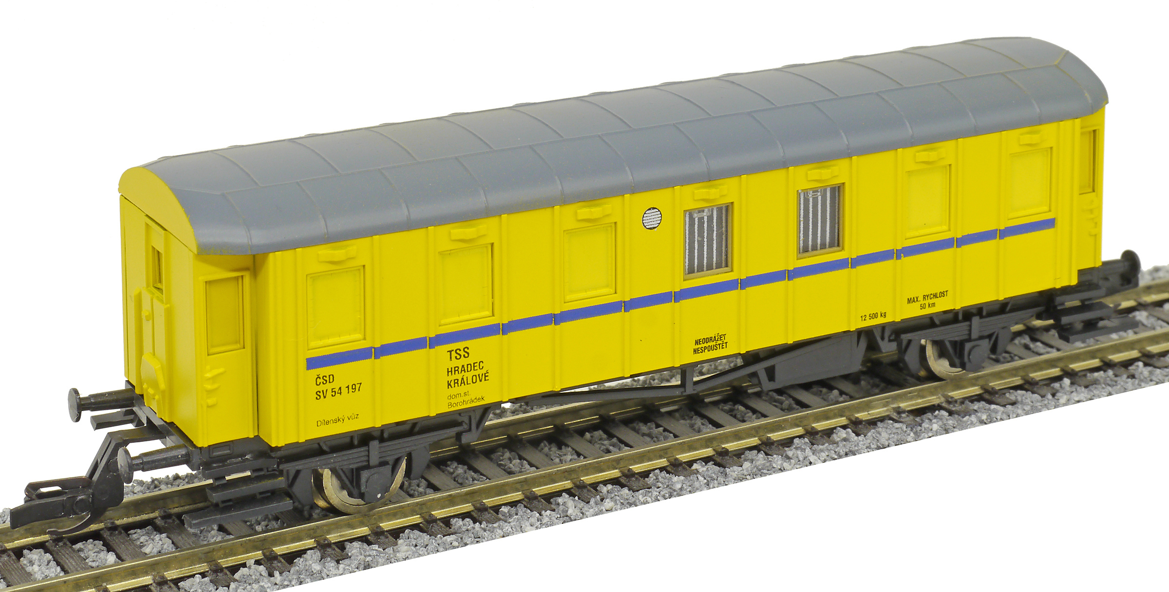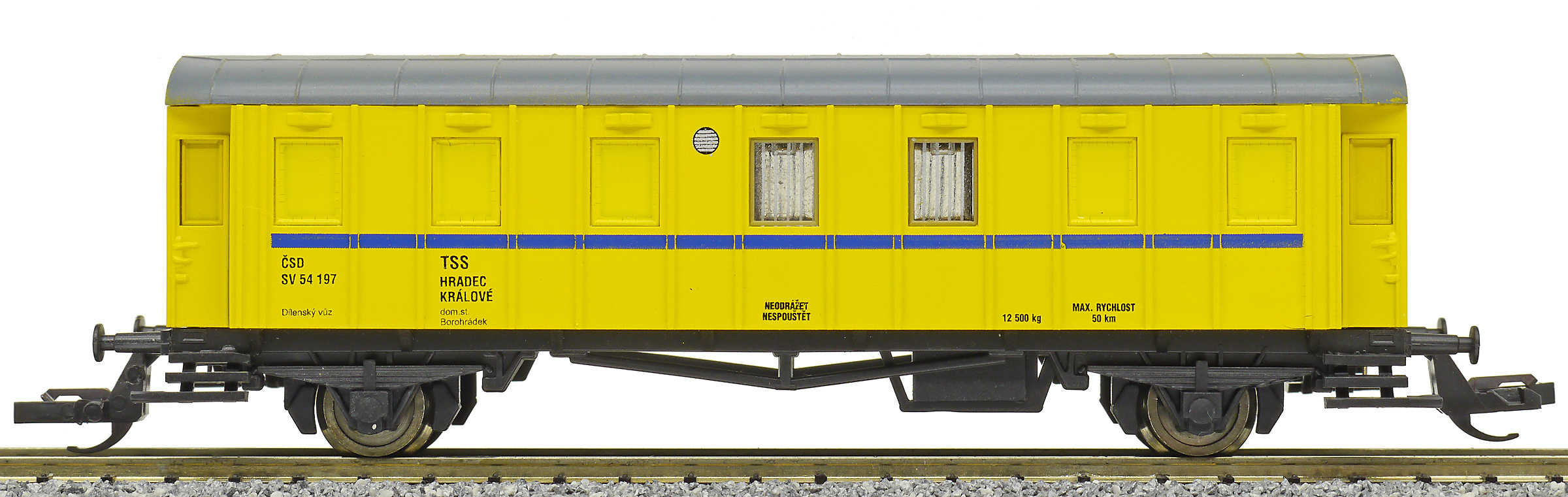 | dílenský vůz žlutý s modrým proužkem a šedou střechou |