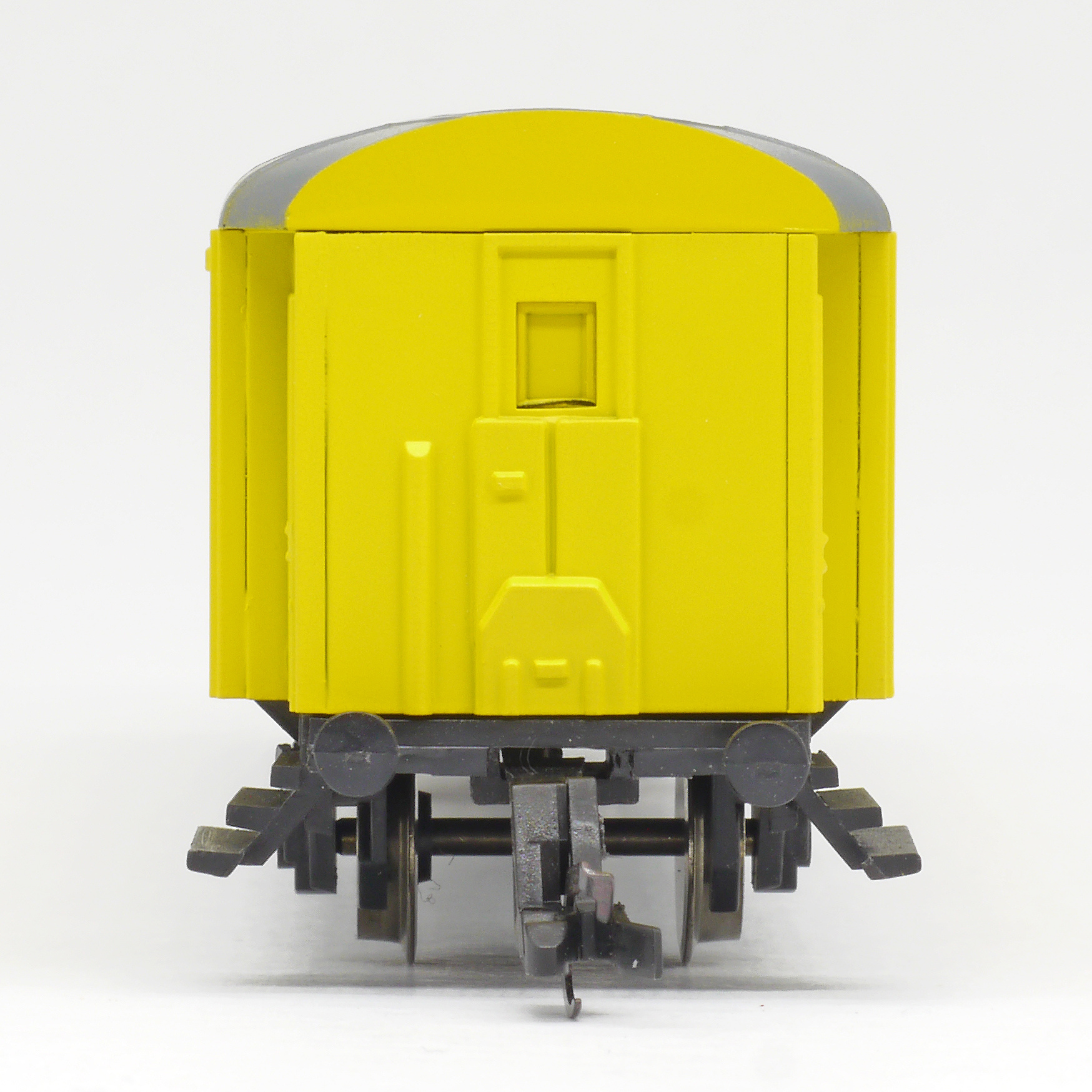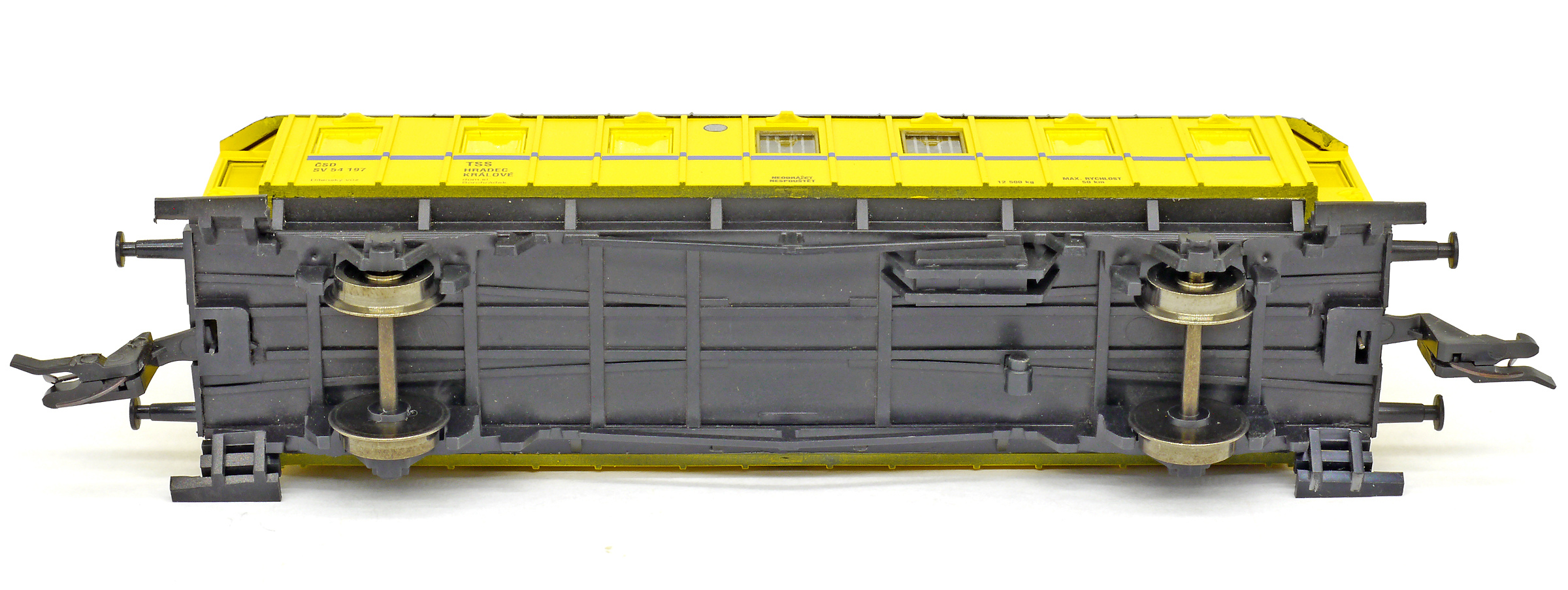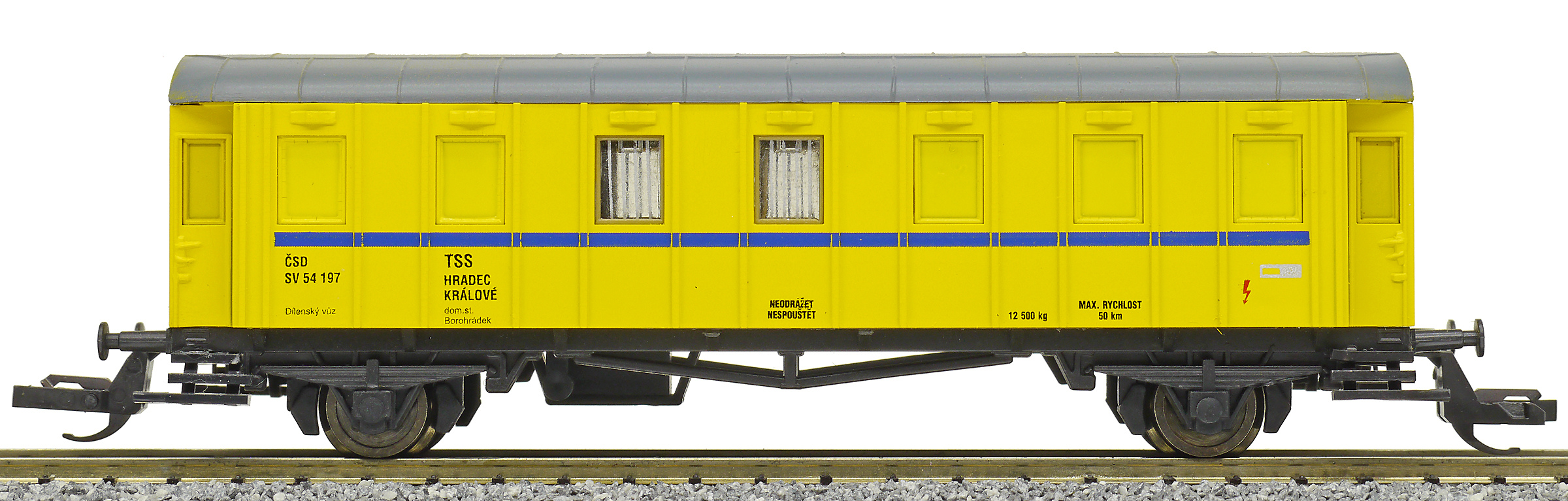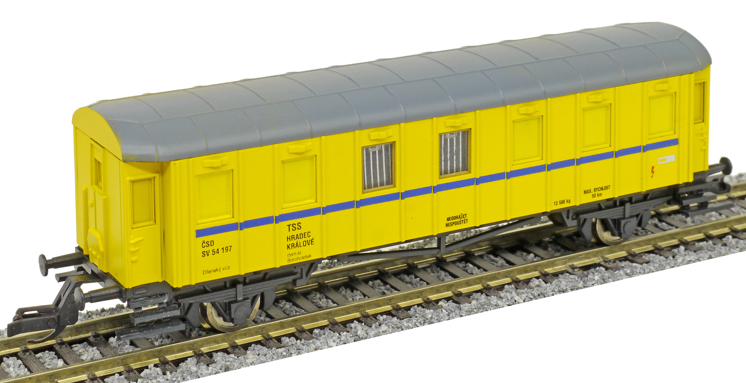 | dílenský vůz žlutý s modrým proužkem a šedou střechou |