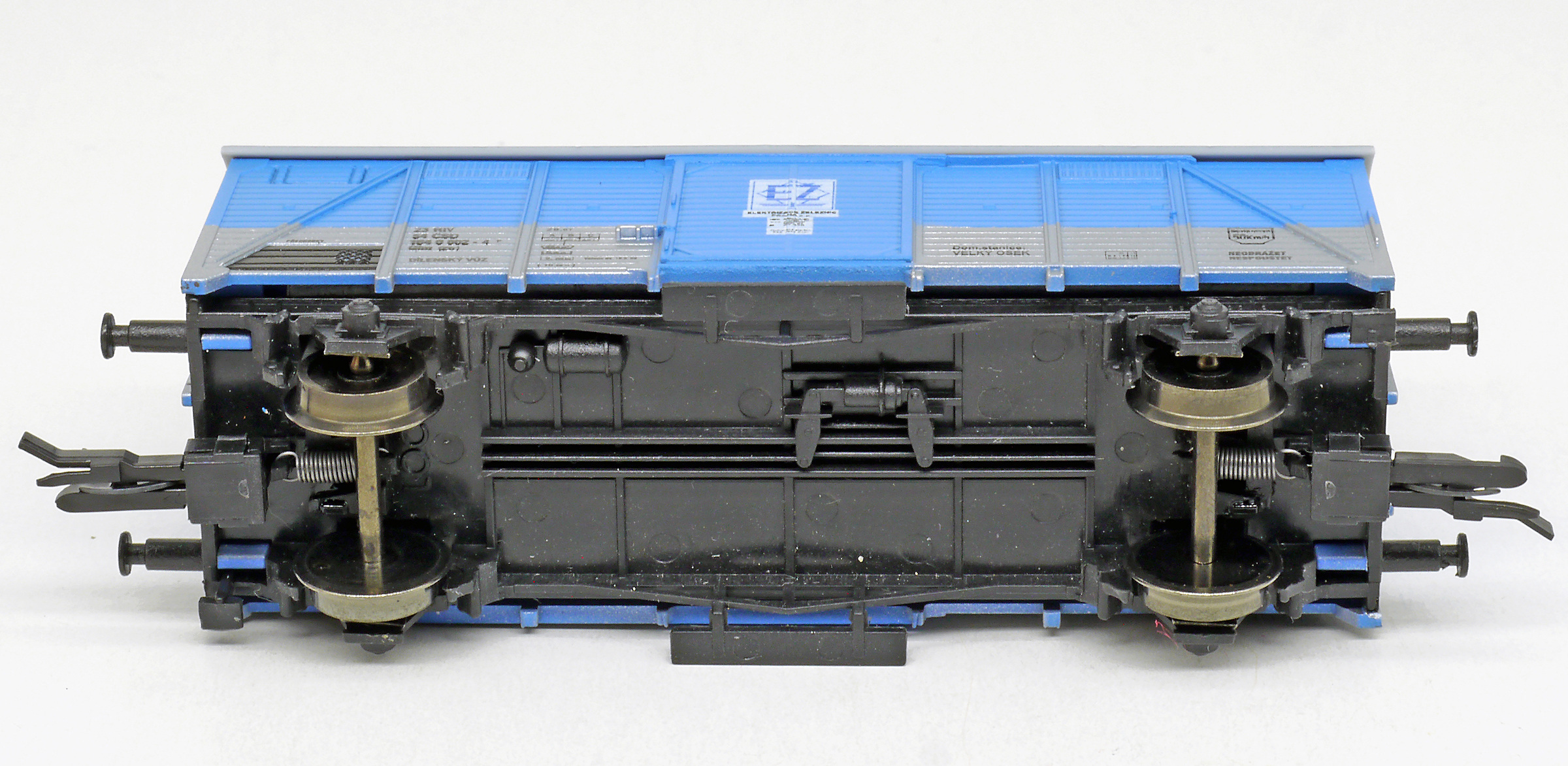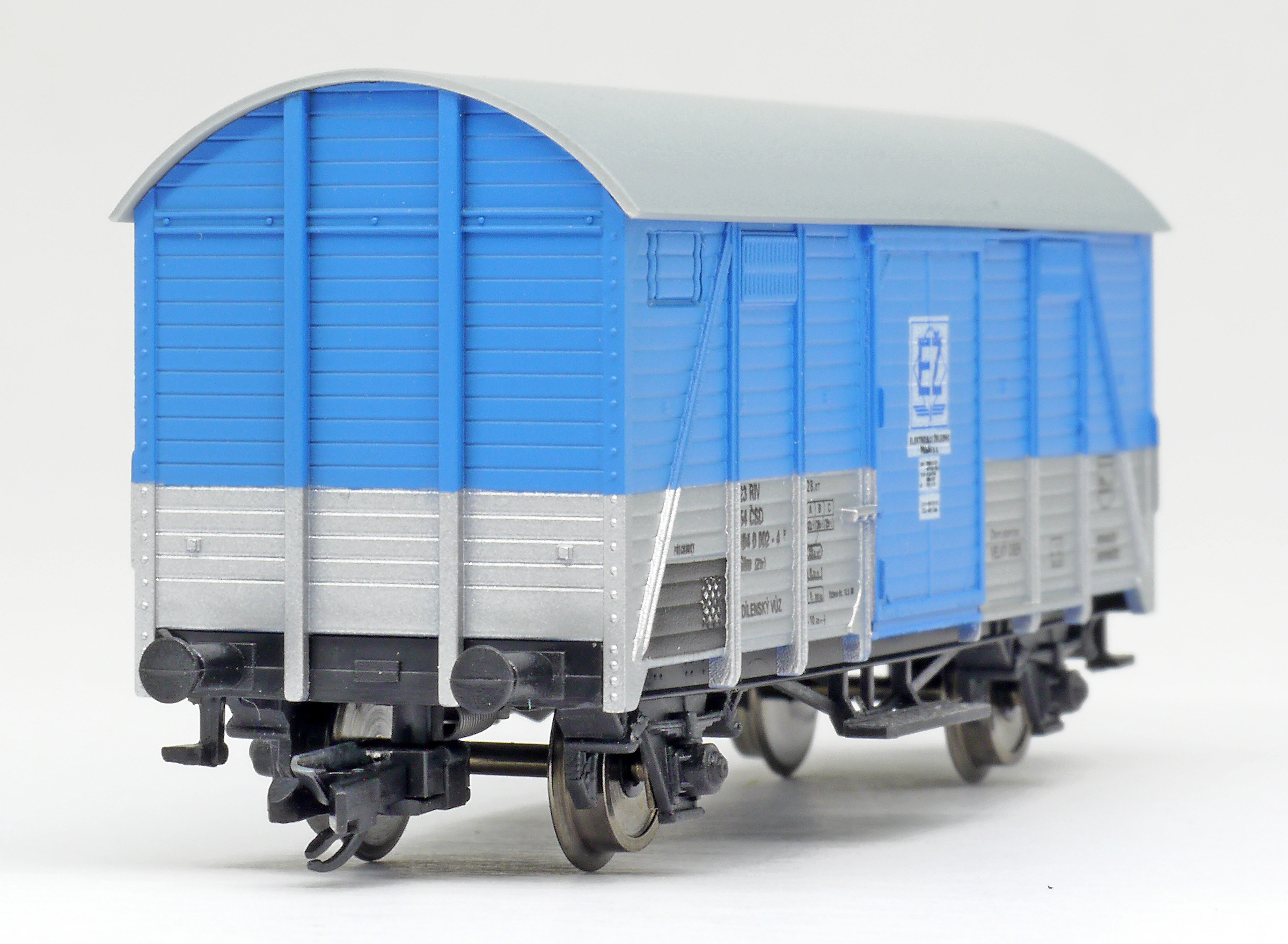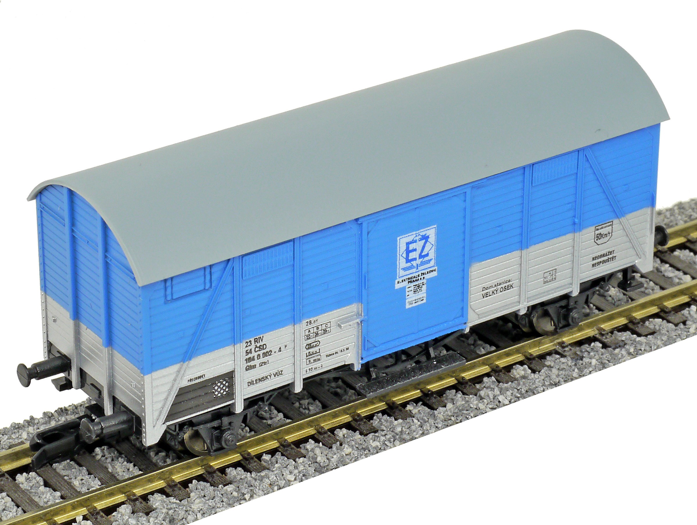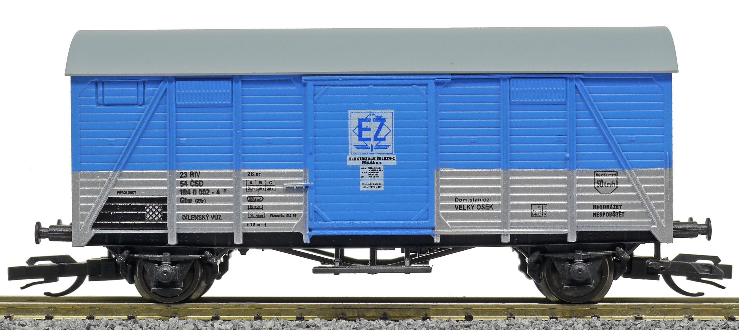 | krytý nákladní vůz modrý-stříbrný s šedou střechou dílenský vůz „Elektrizace železnic“ |