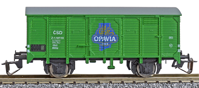 | krytý nákladní vůz zelený s šedou střechou „Opavia“ |