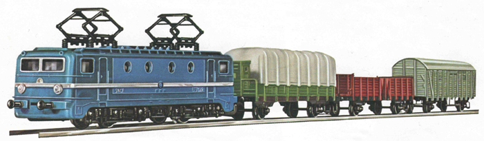 | elektrická lokomotiva, různé barvy plastu, černé plastové pantografy a černá imitace pojezdu |