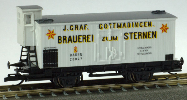 | nákladní chladící vůz bílý s šedou střechou a brzdařskou budkou „Brauerei zum Sternen“ |