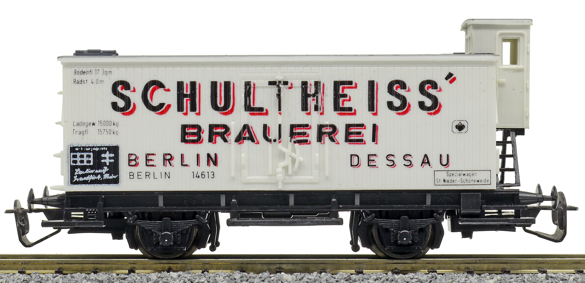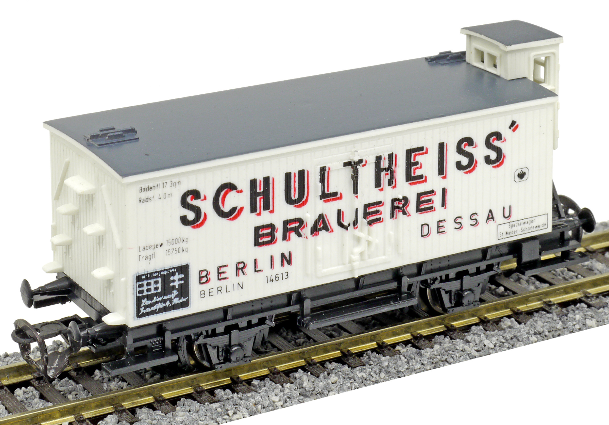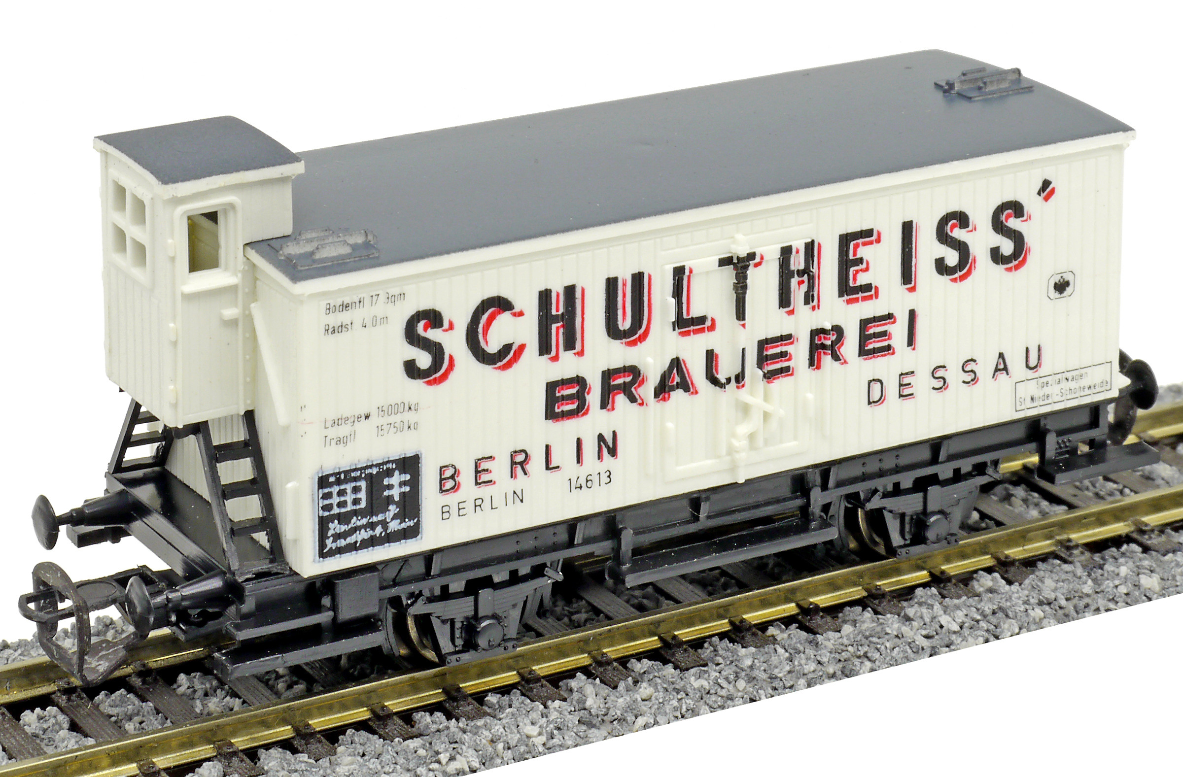 | nákladní chladící vůz bílý s šedou střechou a brzdařskou budkou „Schultheiss“ |