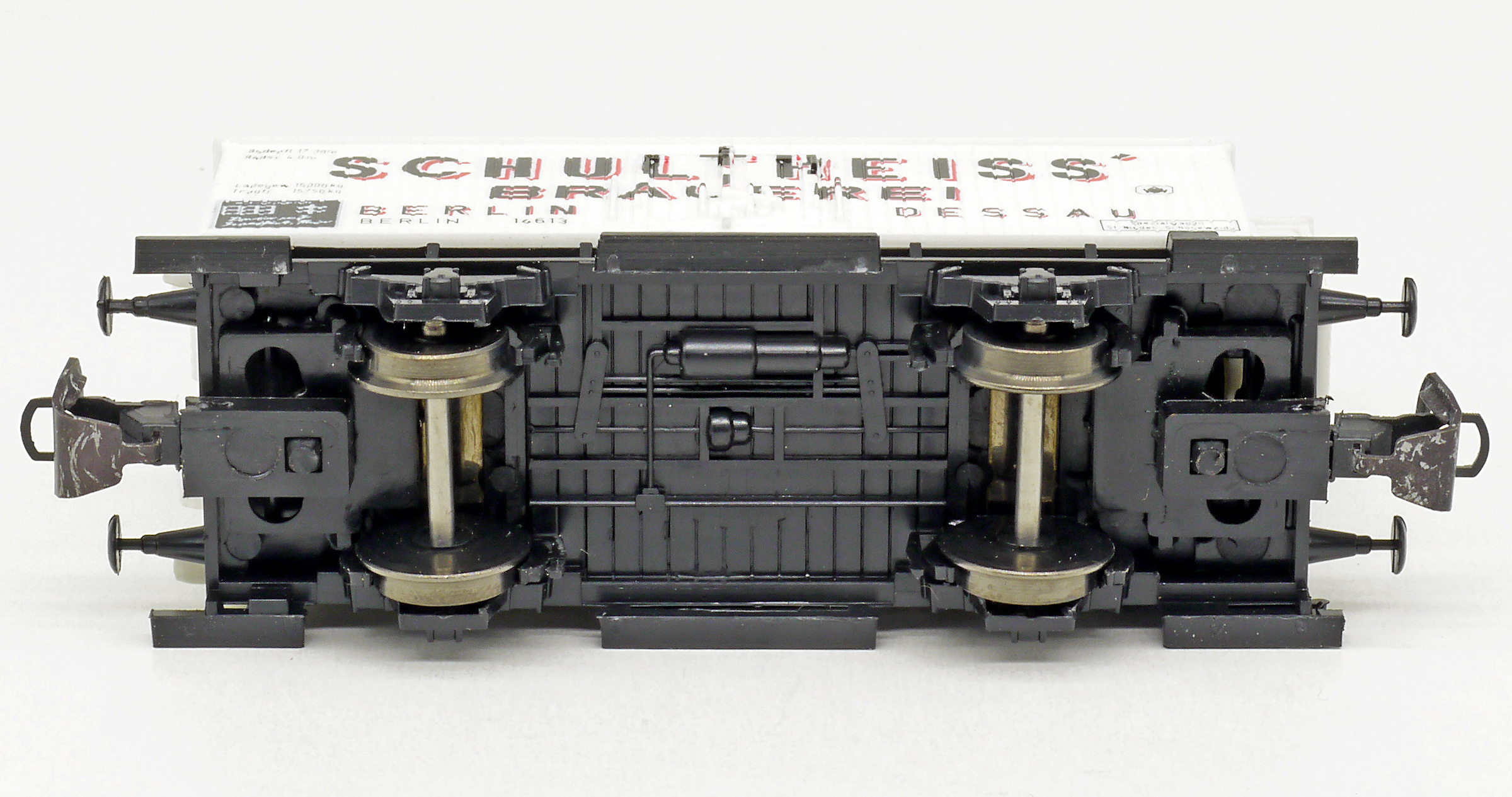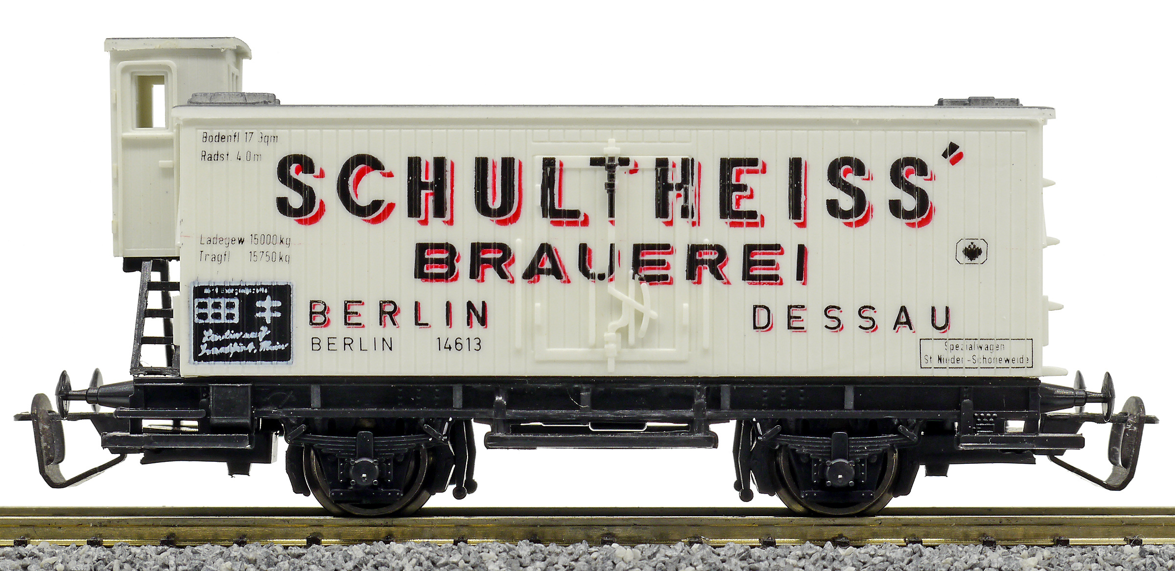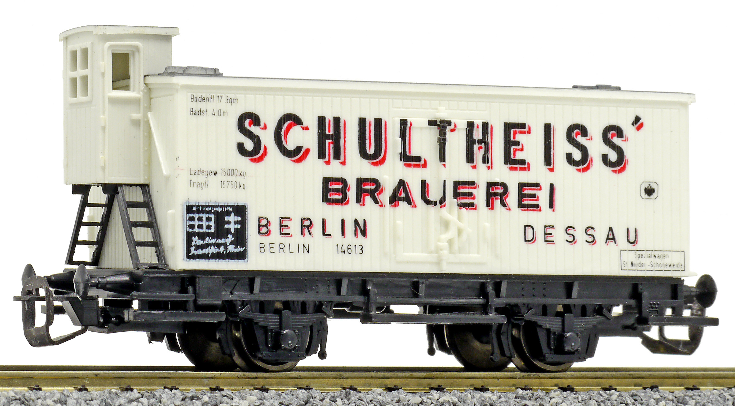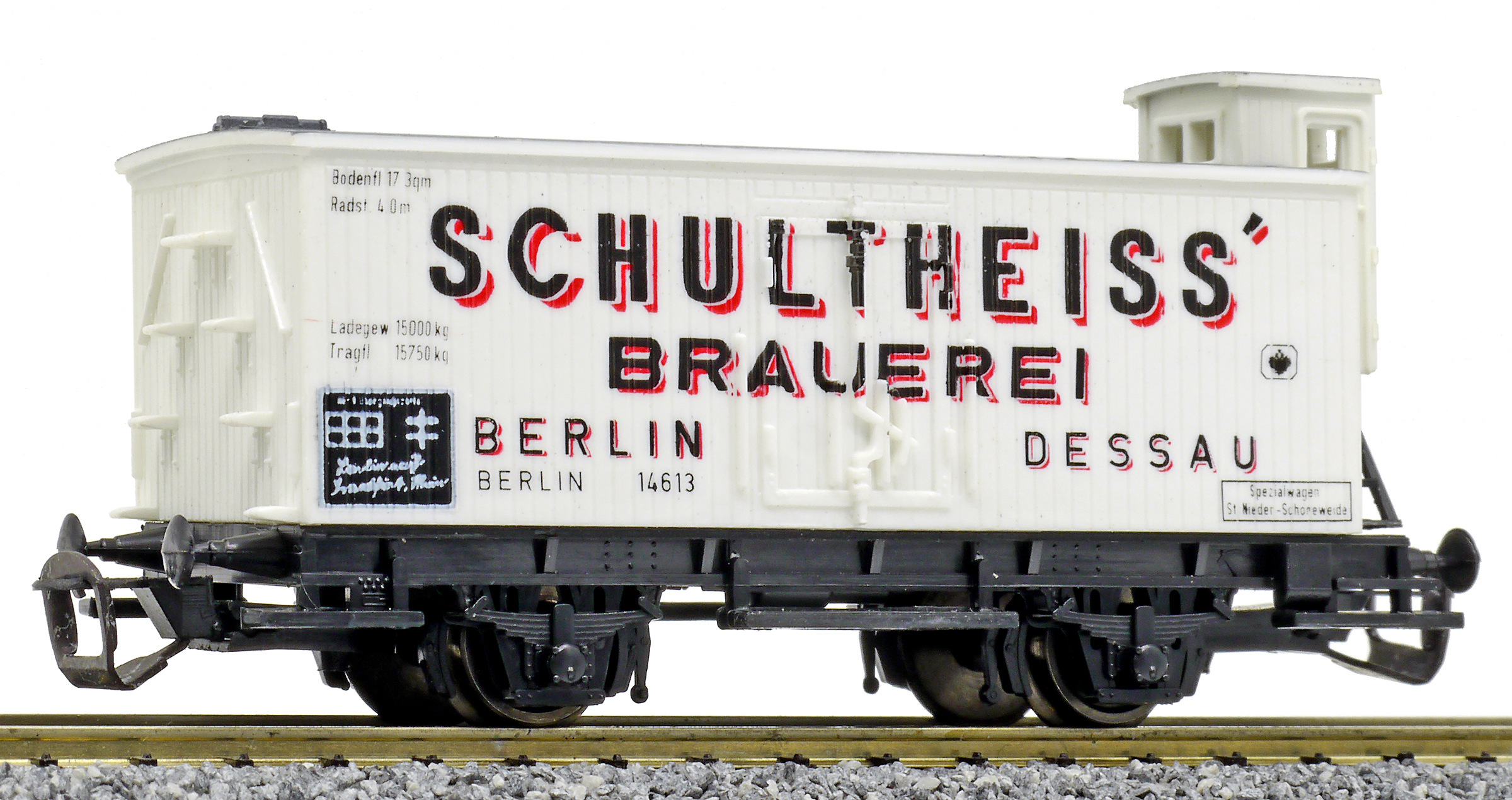 | nákladní chladící vůz bílý s šedou střechou a brzdařskou budkou „Schultheiss“ |