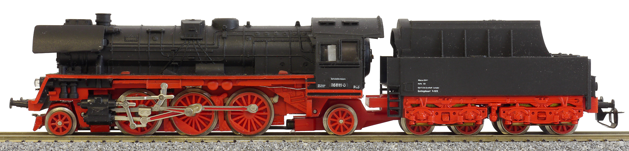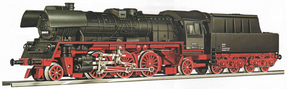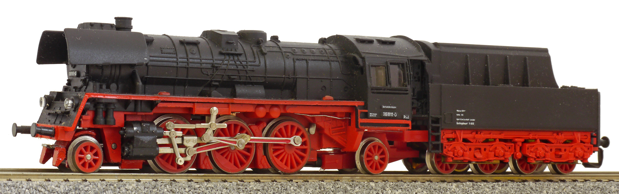 parní lokomotiva černá s červeným pojezdem a kouřovými plechy BR 35