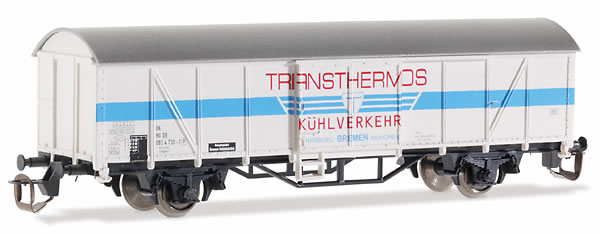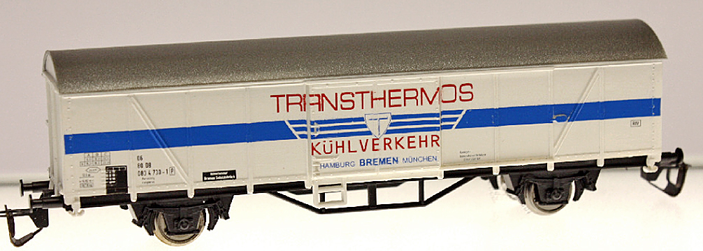 | krytý nákladní vůz bílý s modrý pruhem a stříbrnou střechou „Transthermos“ |