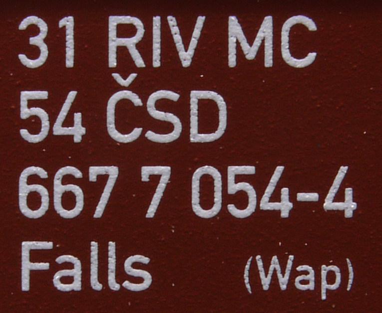| • 31 54 667 7 054-4 | → | nákladní, s podvozky, pevný rozchod, ve vlastnictví železniční správy, RIV, PPV |