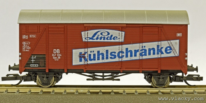 Popis   krytý nákladní vůz červenohnědý se stříbrnou střechou „Linde”
