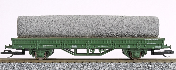 | nízkostěnný nákladní vůz zelený s nákladem betonové roury |