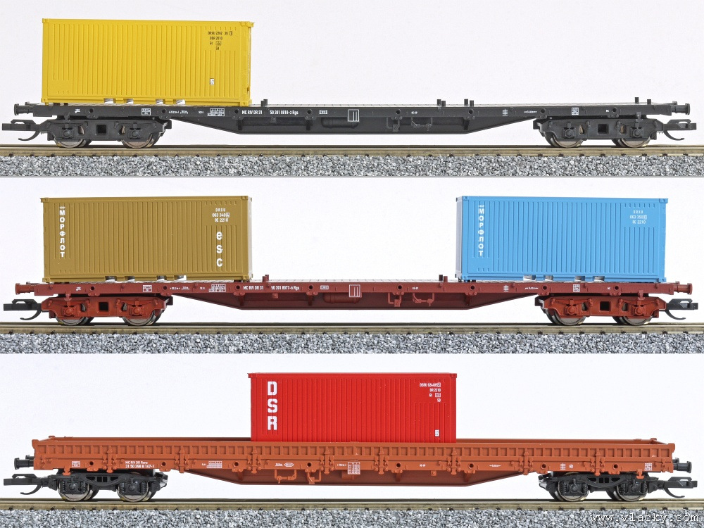 | set tří nízkostěnných vozů s nákladem kontejnerů |