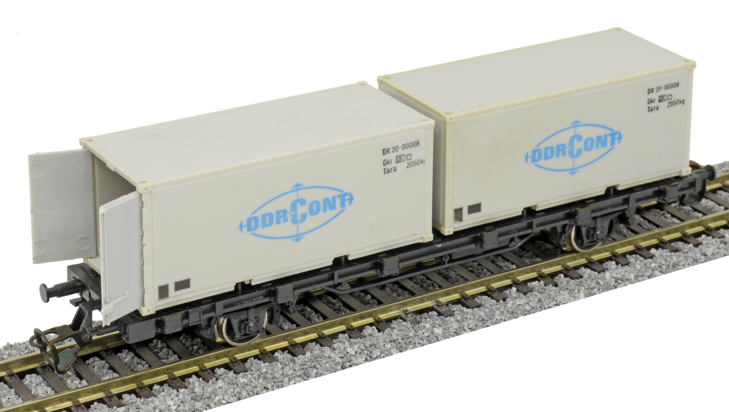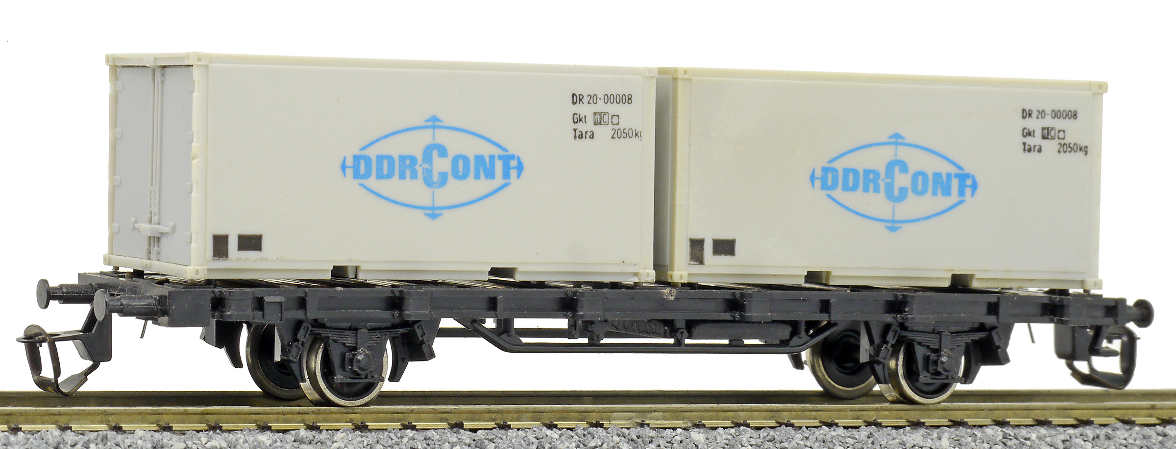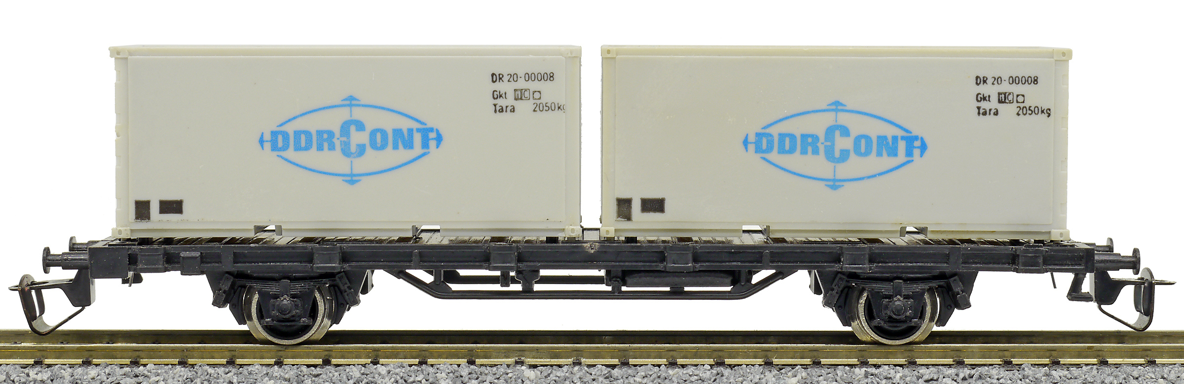 | nákladní plošinový vůz černý se dvěma 20' kontejnery „DDR-CONT“ |